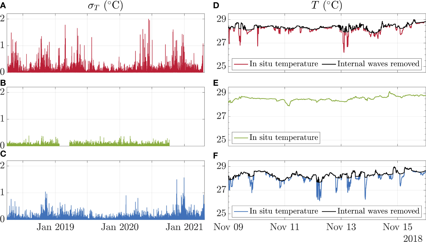 The hourly standard deviation of temperature across (A) Ile Anglaise (red), (B) Ile du Coin (green), and (C) Moresby (blue) between April 2018 and April 2021, as well as in situ temperature profiles, alongside modelled temperature profiles with internal waves removed, over the same 2-week period, across (D) Ile Anglaise, (E) Ile du Coin, and (F) Moresby. Note that no internal waves were detected in Ile du Coin, and therefore no model removing internal waves was run.