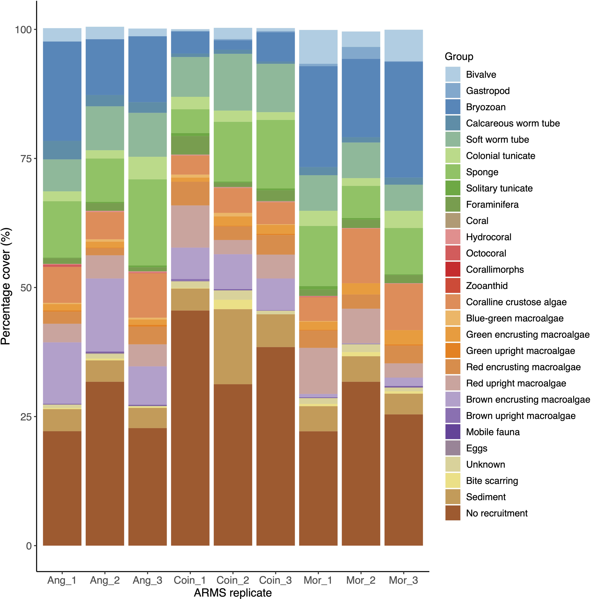 Stacked barplot displaying the percentage cover of sessile taxonomic groups, the percentage of counts assigned to non-sessile taxa as well as other identification groups, across replicates of autonomous reef monitoring structures (ARMS) from each sampling site (Ang, Ile Anglaise; Coin, Ile du Coin; Mor, Moresby).