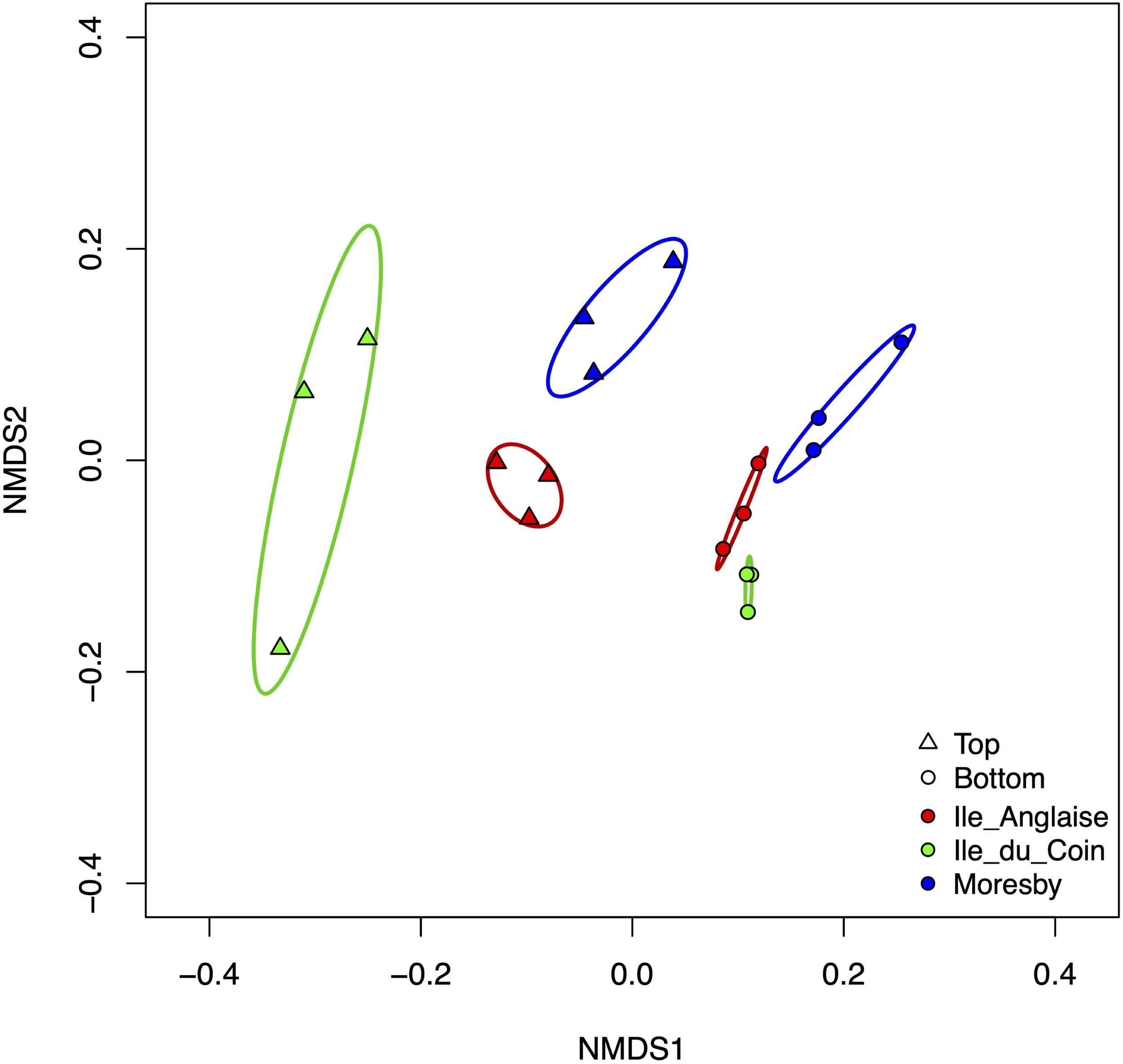The NMDS analysis showed the extent of dissimilarity between the top and bottom plate faces across sampling sites (Figure 6). Whilst the dispersion of data between the top and bottom plate face communities amongst triplicate ARMS was similar within Moresby and Ile Anglaise sites, a large difference was observed within Ile du Coin, with top plate face communities displaying a higher variability than bottom face communities (Figure 6).