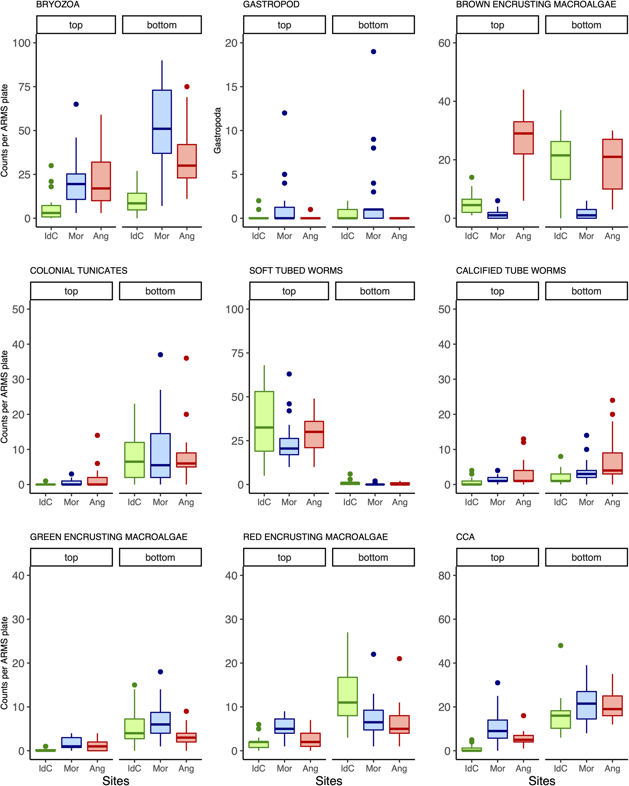 Boxplots comparing the counts of nine taxonomic groups were found to have significantly different abundances across autonomous reef monitoring structures (ARMS) plate face and/or across sampling sites (IdC, Ile du Coin; Mor, Moresby; and Ang, Ile Anglaise).