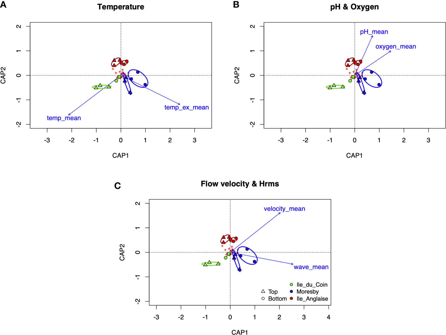 A distance-based redundancy ordination analysis (dbRDA) was used to determine the contribution of environmental parameters to the structure of ARMS cryptobenthic communities observed across sites, using Bray–Curtis distances with the capscale function in the “vegan” package v2.5.7 (Oksanen et al., 2013). The number of site replicates in this study limited our ability to simultaneously model the effect of all environmental variables with diversity patterns observed in our ARMS dataset, and therefore, we conducted individual dbRDAs on mean (i) in situ and ex situ temperature, (ii) pH and oxygen, and (iii) velocity and wave height. Ex situ wave values were not included in this analysis as the WaveWatch III model was unable to determine wave profiles between the Ile du Coin and Moresby sites. PAR and salinity were also not included in this analysis, as no difference was observed in the PAR profiles across sites and the significant profiles in salinity observed between sites were determined not to be biologically significant. ANOVA-like permutation-based tests were carried out to test the significance of each full model using the permutest function. The significance of individual explanatory variables within each model was also tested using the anova.cca function. Ordination plots were then used to visualise modelled relationships between environmental factors and benthic communities for each model.