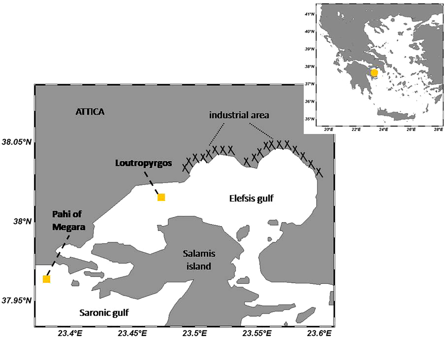 According to the results obtained from the 6-year monitoring of dissolved metal concentrations in coastal and transitional waters of Greece (Tzempelikou et al., 2021), the background upper limits (BAC) mainly of Cu, followed by Zn and Cd, were exceeded within the Gulf of Elefsis. Despite the great anthropogenic pressures and pollution occurring, the western part of the gulf is particularly productive, as reflected in the higher chlorophyll a (Chla) levels measured at the area of Loutropyrgos in comparison to Pahi of the Megara site (Karavoltsos et al., 2015).