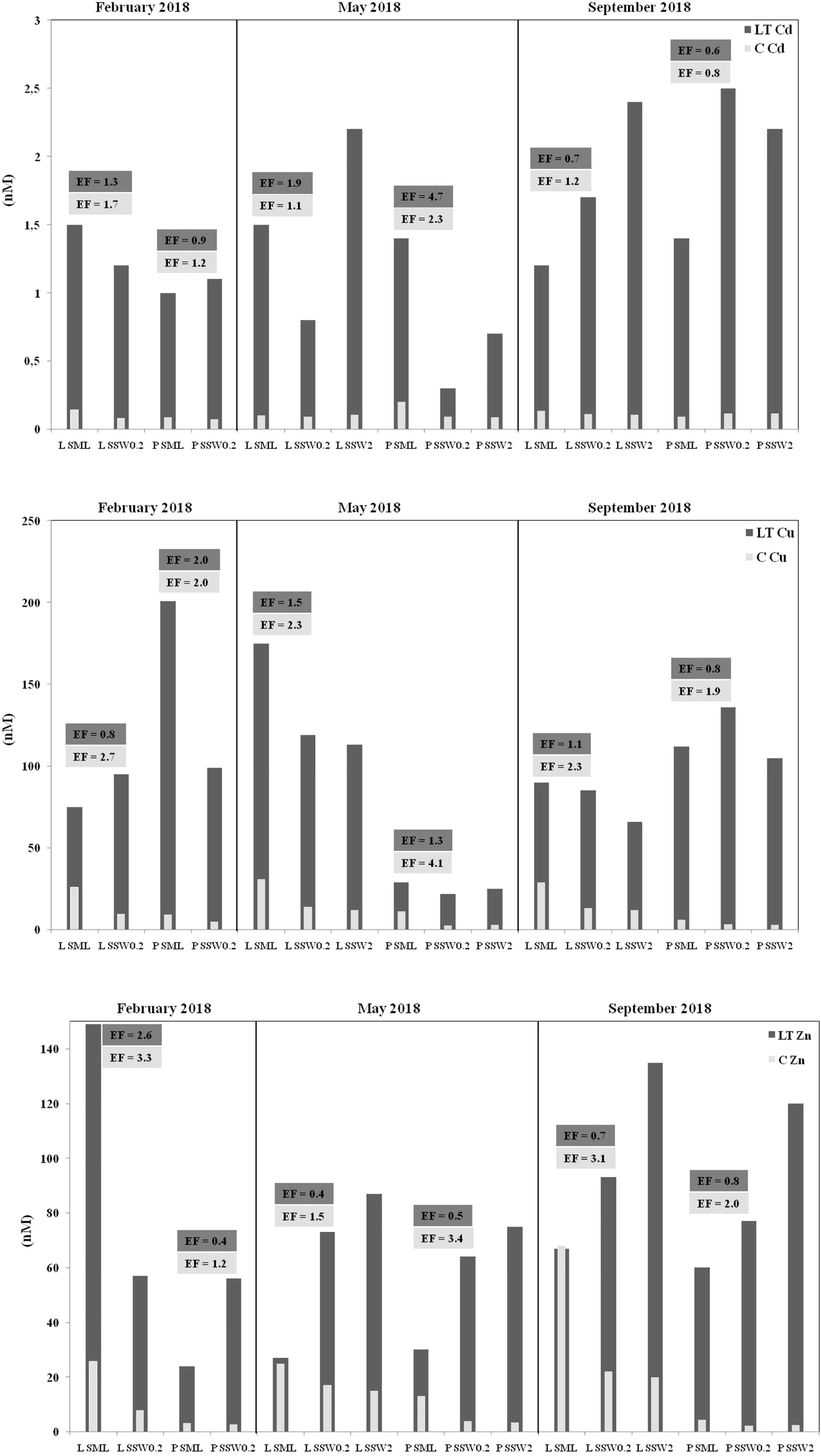 Homogeneity characterizes average dissolved Cd concentrations, both among different depths (0.125 ± 0.042 nM, 0.094 ± 0.017 nM, and 0.102 ± 0.012 nM in SML, SSW0.2, and SSW2, respectively), as well as among different sampling sites and seasons (Figure 2; Table S3). These findings reflected on the enrichment factor in SML (mean EF = 1.4 ± 0.5), not significantly differing from unity (p = 0.070). Similar levels of average Cd complexing capacity (LCd) were obtained at the various sampling depths examined (1.3 ± 0.2 nM, 1.3 ± 0.8 nM, and 1.9 ± 0.8 nM in SML, SSW0.2, and SSW2, respectively). No literature data concerning LCd and LZn in the SML are so far available.