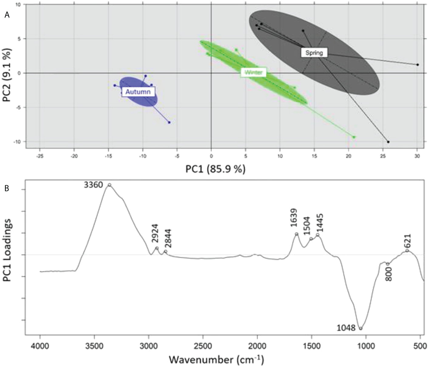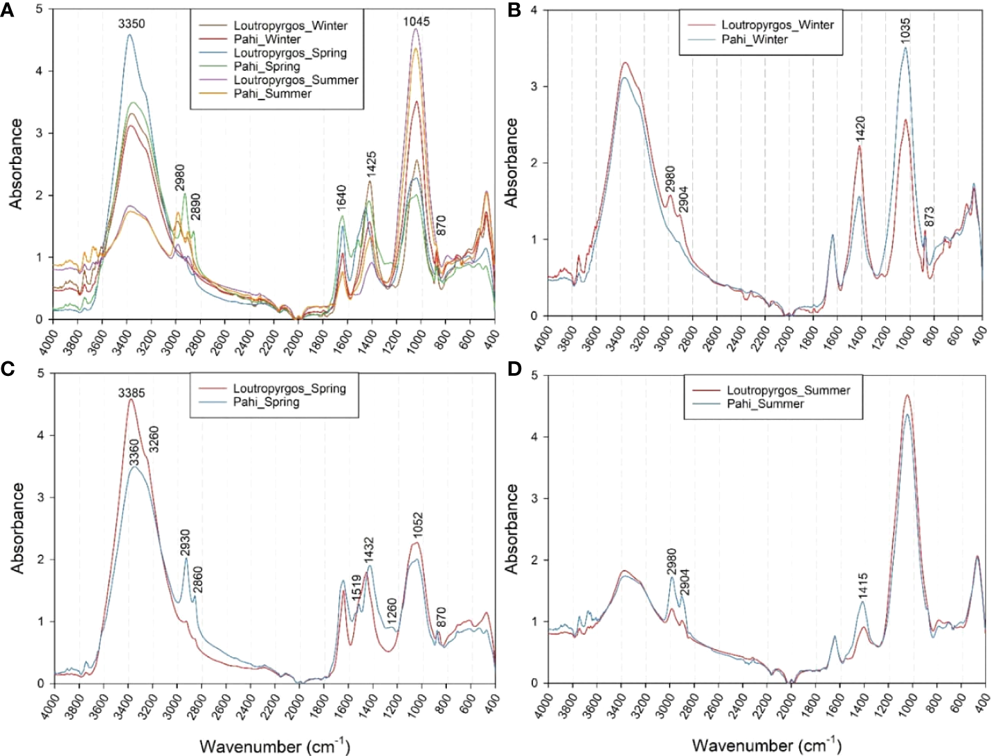 The FTIR spectra of the GF/F filters were recorded by a Spectrum Two FTIR spectrometer equipped with a Diamond ATR compartment (Perkin Elmer, USA) using the provided Spectrum 10 spectroscopy software. For each sample, 32 scans of the infrared region between 4,000 and 400 cm-1 at a resolution of 4 cm-1 were recorded in triplicate and averaged. The recorded spectra were then ATR-corrected with a refractive index of 1.5, smoothed by the Savitzky–Golay algorithm (total window of nine smoothing points and a zero-order polynomial), linearly baseline corrected and normalized by the mean using The Unscrambler 10.5 software (Camo, Norway).