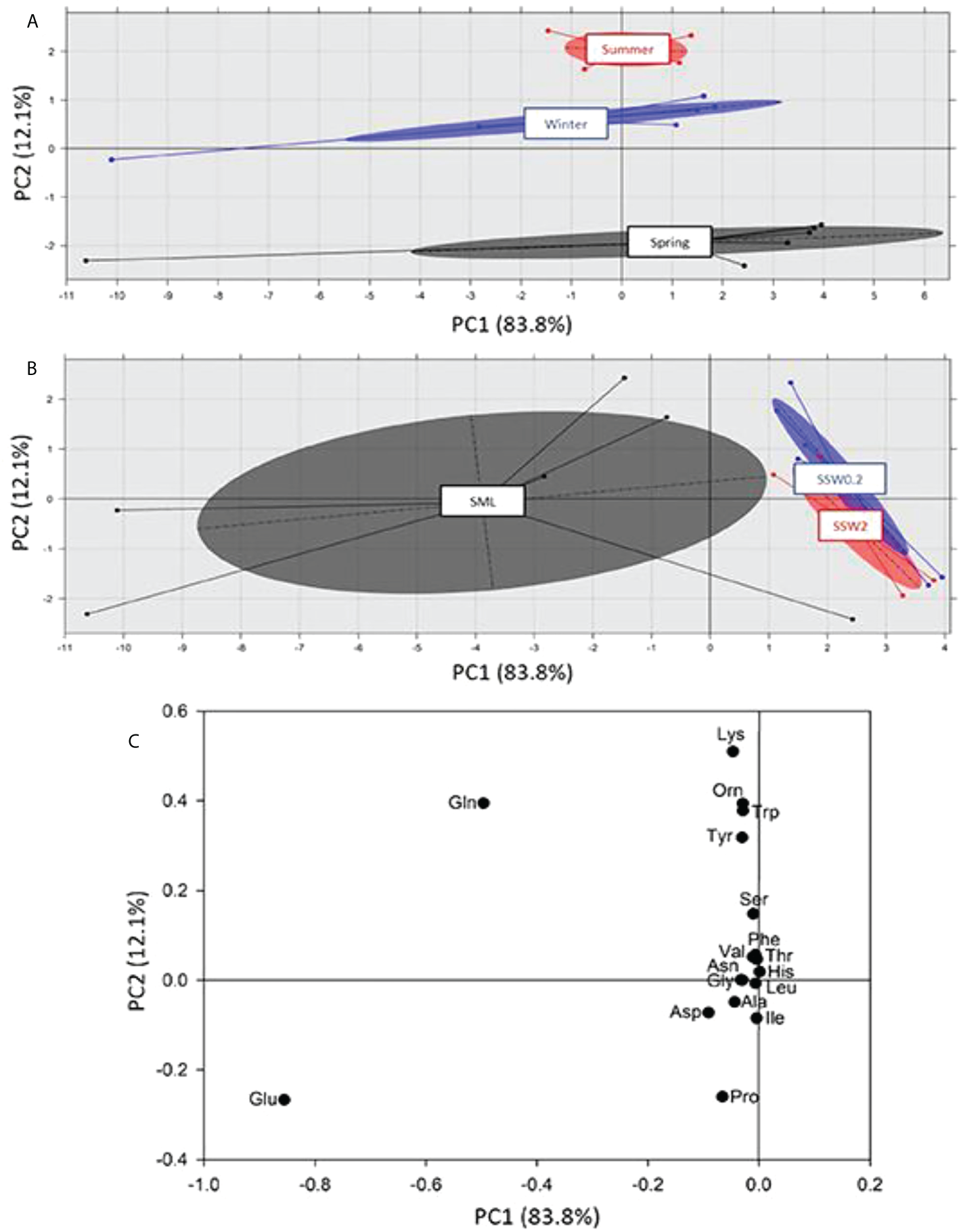 Eighteen amino acids were detected and quantified, namely, alanine, glycine, valine, leucine, isoleucine, threonine, serine, proline, asparagine, aspartic acid, glutamic acid, phenylalanine, glutamine, ornithine, lysine, histidine, tyrosine, and tryptophan. Among those, glutamic acid was the predominant one, in agreement with previous studies (Kuznetsova et al., 2004; Yang et al., 2009; Chen et al., 2013), followed by glutamine, lysine, ornithine, tryptophan, and tyrosine, with the majority previously reported in literature (Kuznetsova et al., 2004; Yang et al., 2009; Chen et al., 2013; How et al., 2014). Concentrations of FAAs ranged from 6.3 ± 1.8 to 31.0 ± 1.6 μg L-1 in SML samples, with glutamic acid, glutamine, lysine, ornithine, tryptophan, and tyrosine being the predominant ones, 2.4 ± 0.3 to 16.8 ± 1.6 μg L-1 in SSW0.2 samples, with glutamine, glutamic acid, lysine, ornithine, tryptophan, and tyrosine being the most abundant, and 2.7 ± 0.5 to 11.8 ± 0.6 μg L-1 in SSW2 samples, with glutamic acid, lysine, tryptophan, ornithine, tyrosine, and glutamine prevailing (Table S4; Supplemental Material).