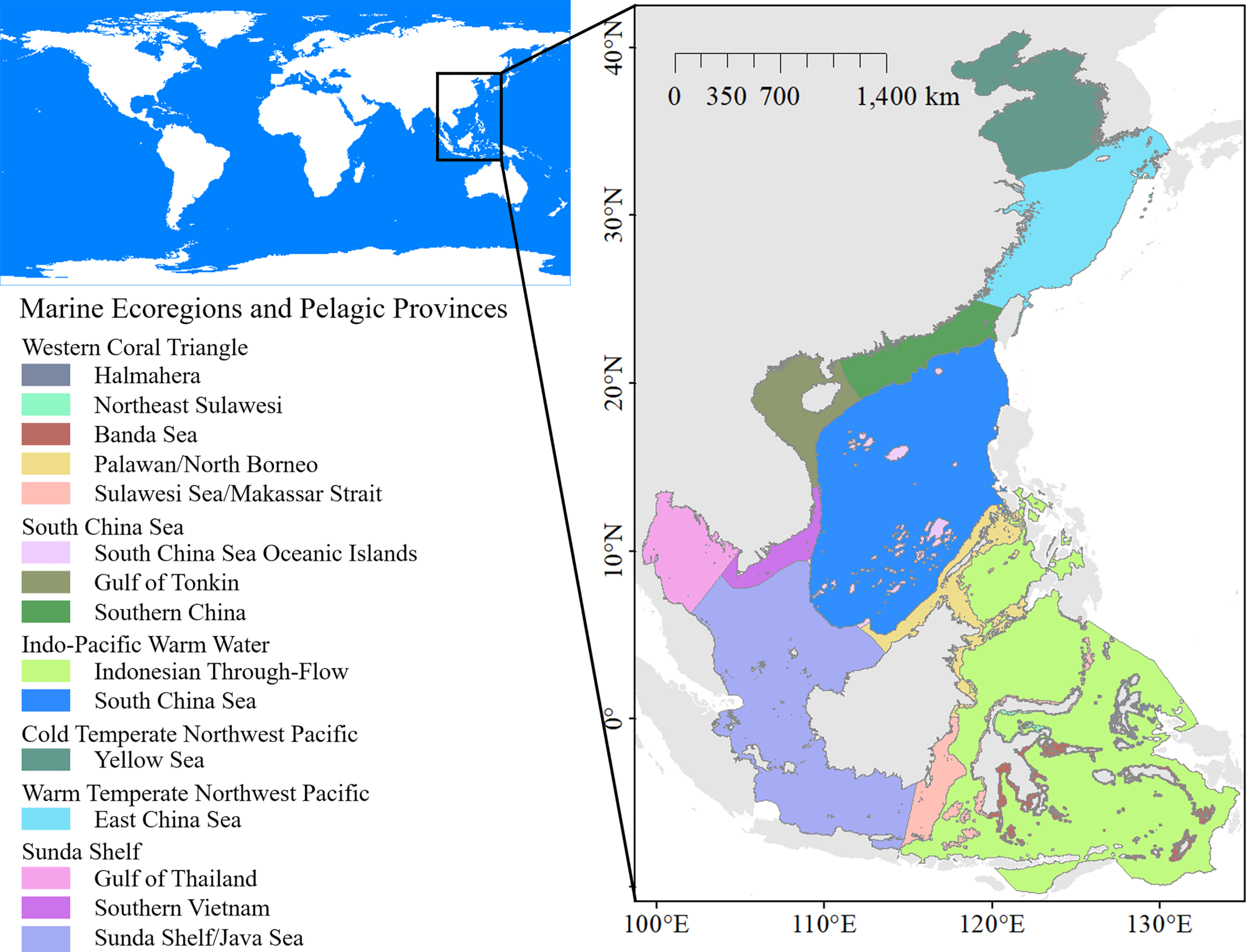 The study region, marine ecoregions, and the pelagic provinces.