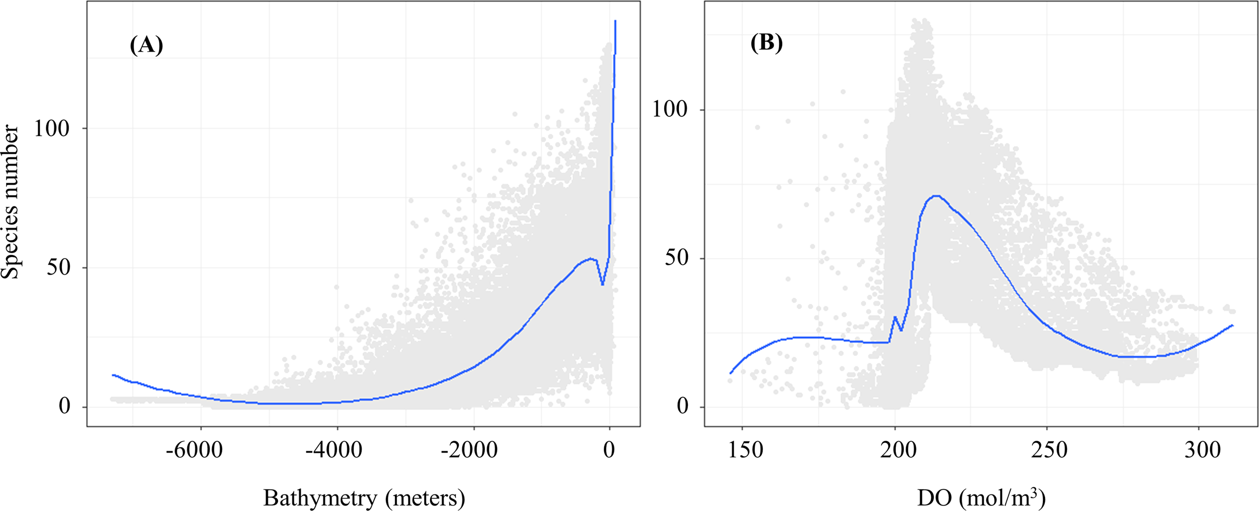 Response curves among species number and the key environmental drivers (A. Bathymetry; B. DO).