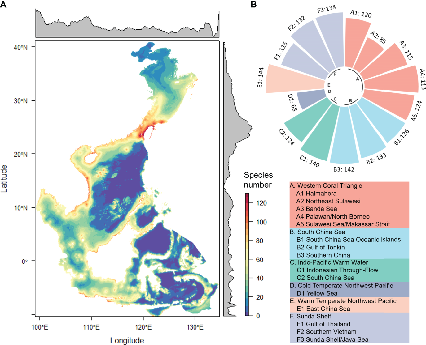 Species abundance distribution (A) and species number in each marine ecoregion and pelagic province (B).