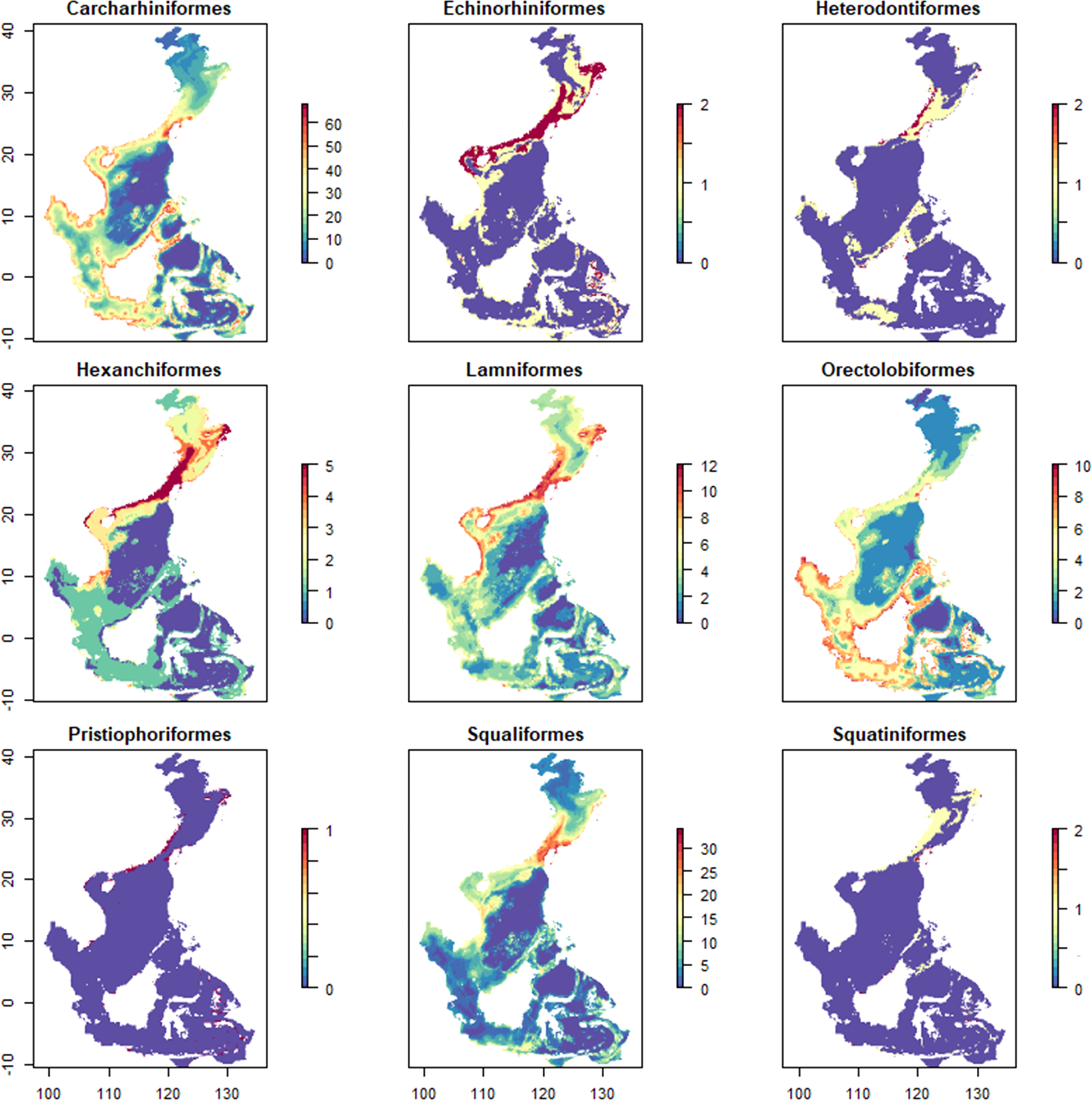 The distribution of the different taxa varied substantially (Figure 4). The Carcharhiniformes had the highest species richness (79 species) and were the most widespread taxon with a distribution encompassing almost the entire coastline of the study area. The species richness of the Squaliformes was also high with 38 species, but the distribution range was concentrated in the East China Sea. The Pristiophoriformes had the lowest species richness and narrowest distribution range. The Orectolobiformes preferred lower latitudes than the other orders and were distributed within the latitudinal range of 0 ± 10°.
