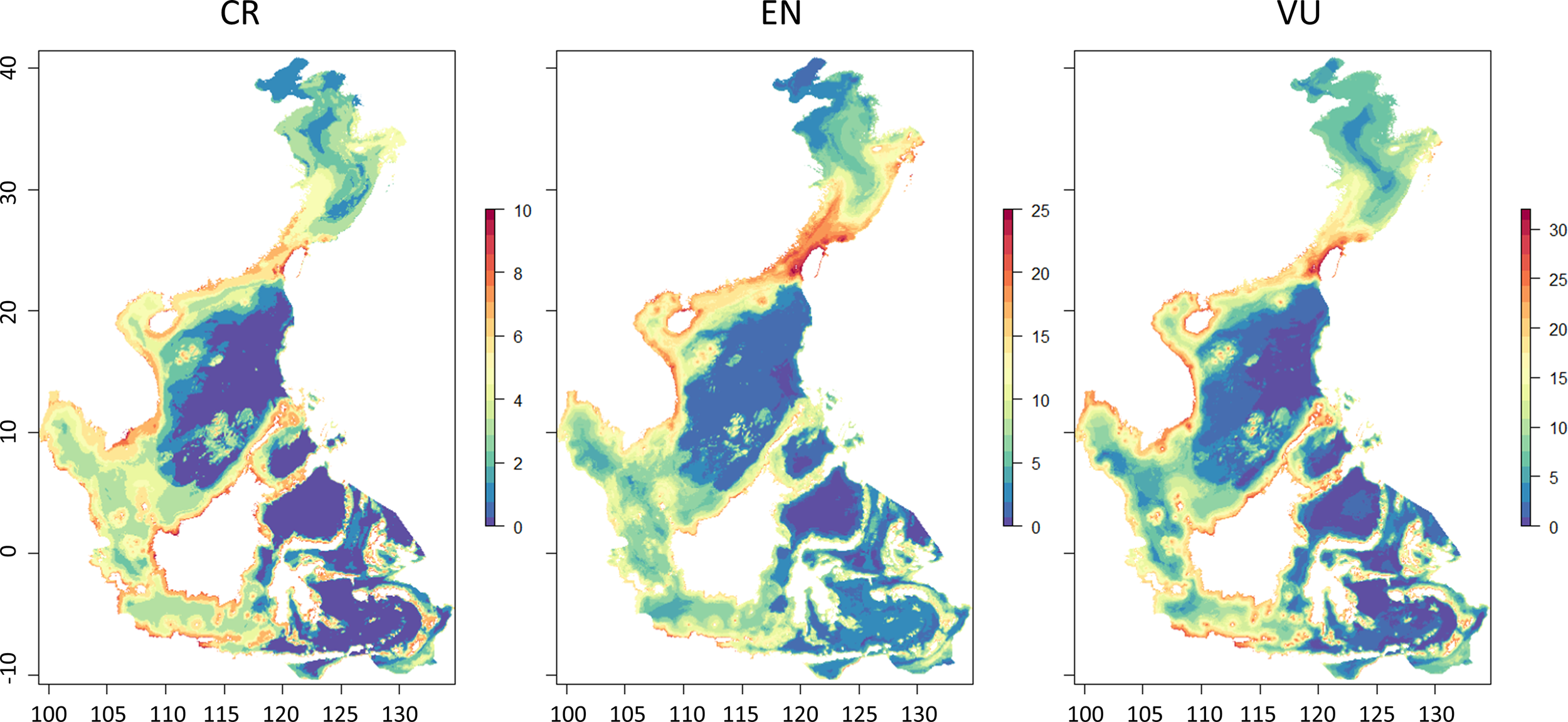 The present study investigated diversity distribution patterns and conservation priorities for sharks in the China and the ASEAN seas based on 149 species owing to data availability. However, according to historical records, there are approximately 196 shark species in this area. Habitat descriptions of the missing 47 species can only be found in the literature and through expert knowledge without enough occurrence records (Lucifora et al., 2011). The lack of reliable distribution information hinders the comprehensive mapping work. Furthermore, anthropogenic activities and climate change factors, which have been added to the SCP as cost layers in recent studies, were not included in this study (Stein et al., 2018; Arafeh-Dalmau et al., 2021). This study was a preliminary attempt to understand the diversity hotspots and conservation priority areas for sharks in the China and ASEAN seas. Future studies should further evaluate spatial and temporal distribution patterns under anthropogenic drivers and climate change.