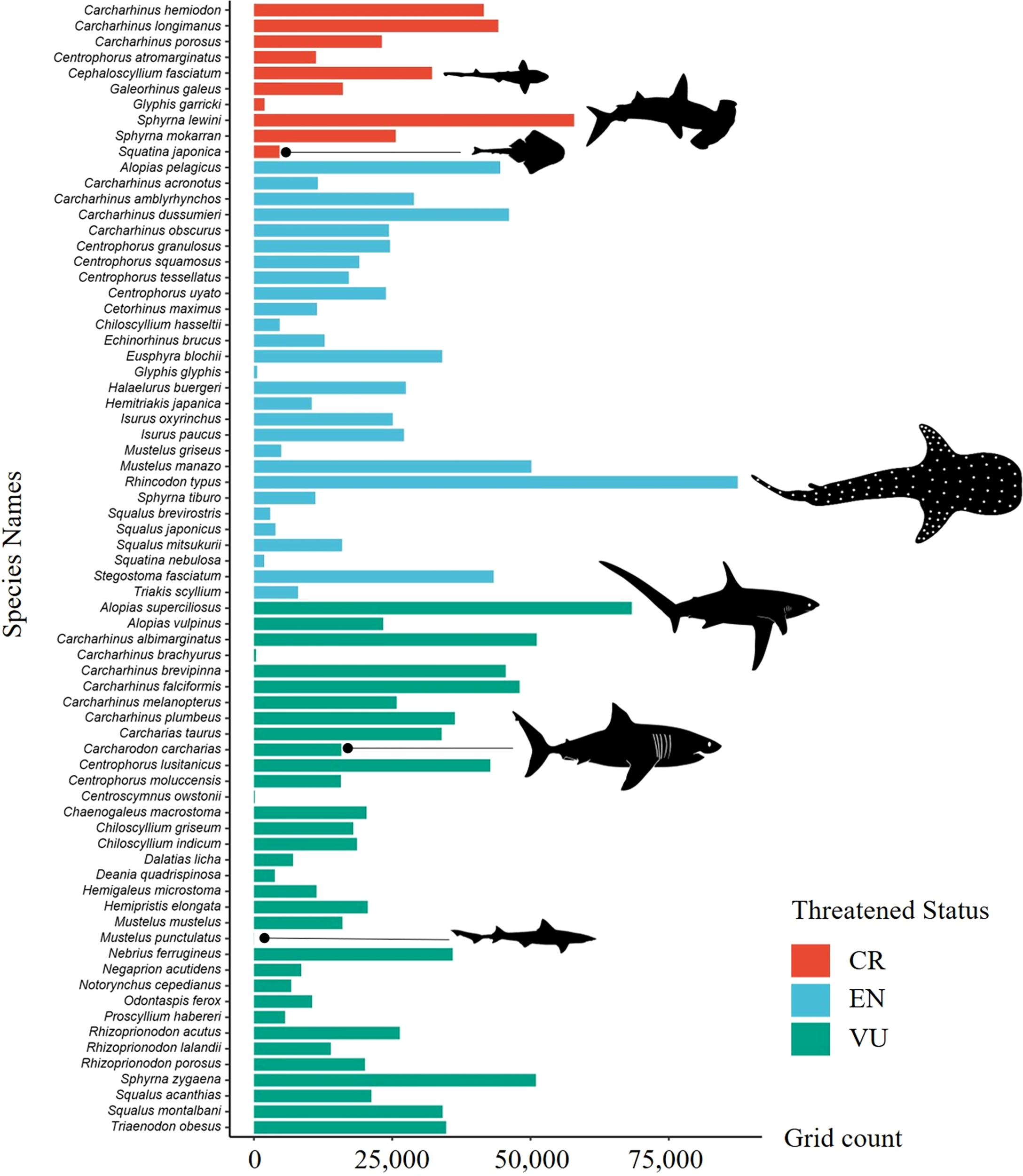 The distribution of ETP species was mapped according to their endangered status, and the results showed that the CR species were predominantly distributed to the south of 30°N, while EN and VU species have pronounced diversity hotspots in the Taiwan Strait (Figure 5). The distribution ranges of the different ETP species substantially varied (Figure 6). Among the 72 ETP species, the whale shark (R. typus) was the most widely distributed, with a predicted distribution range of 87,465 grid cells, followed by the bigeye thresher (Alopias superciliosus) with 68,315 grid cells, and the scalloped hammerhead (Sphyrna lewini) with 57,884 grid cells. The distribution of the blackspotted smooth-hound (Mustelus punctulatus) was the narrowest, with a predicted distribution range of 32 grid cells.