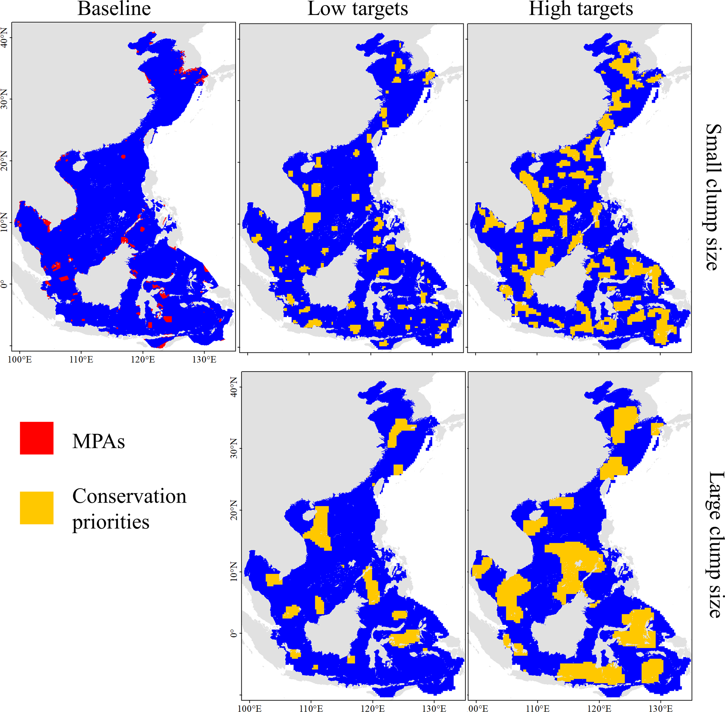 | High target-large clump | 30% | 10% of the area with the highest 45% of species richness | 30% of the ETP species | 30% of each ecoregion | 0.1 |