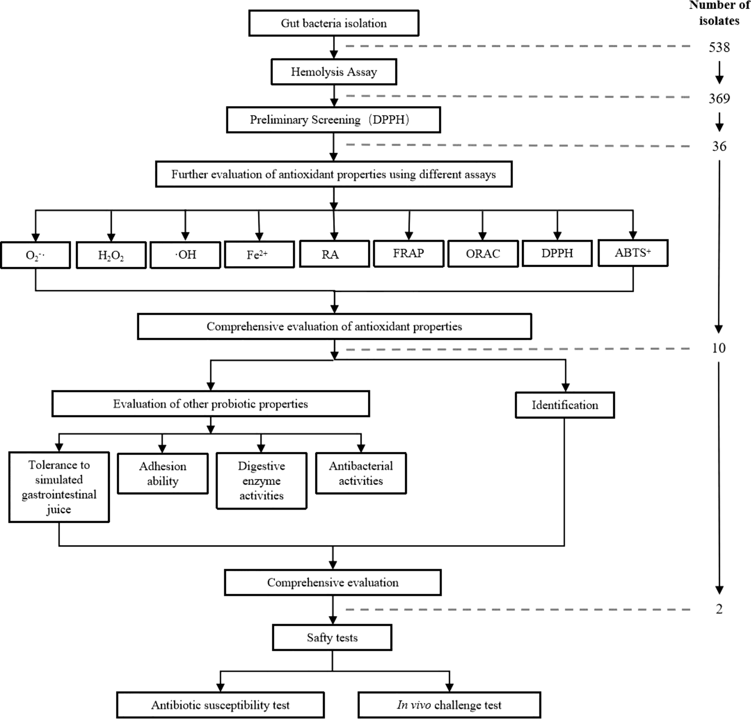 Reports on screening of antioxidant probiotics from fish are rare. In vitro screening of probiotics was economical and practical. The methods for determining the antioxidant activity of probiotics in vitro include 2,2-Diphenyl-1-Picrylhydrazyl (DPPH) assay, 2,2’-azino-bis (3-ethylbezothiazoline)-6-sulfonic acid (ABTS+) assay, ferric ion reducing antioxidant power (FRAP) assay, hydroxyl radical scavenging activity assay, reducing activity assay, chelating ability on ferrous ions assay, hydrogen peroxide resistance assay, and oxygen-radical absorbance capacity (ORAC) assay (Liu et al., 2011; Gao et al., 2013; Li et al., 2013; Mu et al., 2018; Son et al., 2018; Ramalho et al., 2019; Sui et al., 2020). Each determination method has its own advantages and disadvantages, and each has a specific target in the well-defined matrix, therefore comprehensive evaluation by using a variety of methods is more convincing (Mishra et al., 2015).
