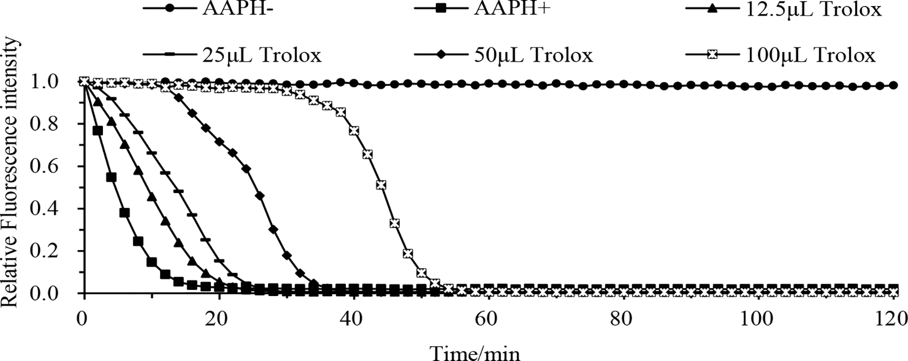 The Net AUG values were obtained by subtracting the AUG value of the blank from that of the sample. The standard curve was prepared with Net AUG of 12.5, 25, 50, and 100 μM Trolox solution. The ORAC of samples were calculated according to the standard curve, and the results were expressed as the equivalent amount of Trolox solution (μM). The standard curve is: y=0.3805x-2.5934, r2 = 0.998 (x: The concentration of Trolox solution; y: The values of Net AUG).