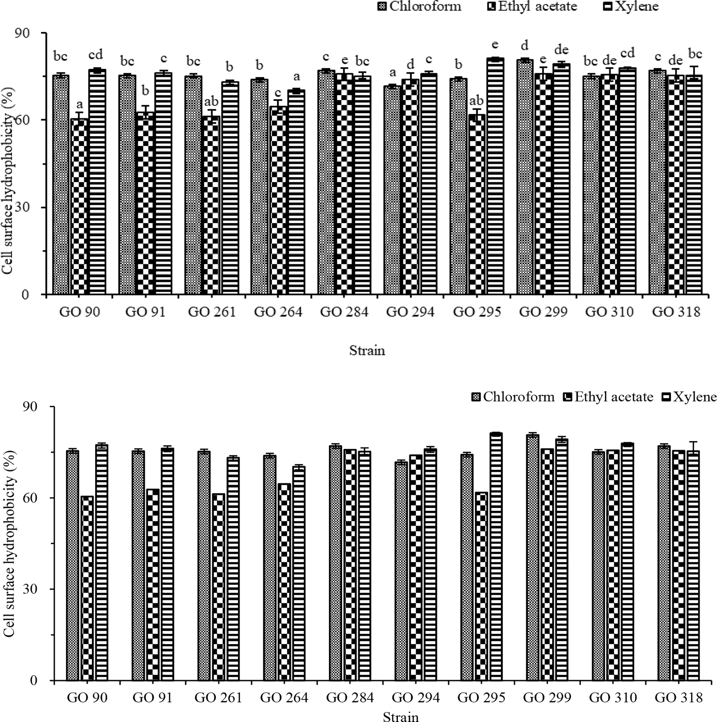 The assay of bacterial cell surface hydrophobicity test was carried out according to (Kavitha et al., 2018; Govindaraj et al., 2021) and slightly modified. Briefly, three organic solvents (xylene, chloroform, and ethyl acetate) were used to detect the surface hydrophobicity of selected isolates. Then 1 mL of isolate samples was evenly mixed with 200 µL solvent and kept at room temperature for 30 min, and the absorbance of upper suspension was measured at 600 nm. The bacterial cell surface hydrophobicity is defined as: