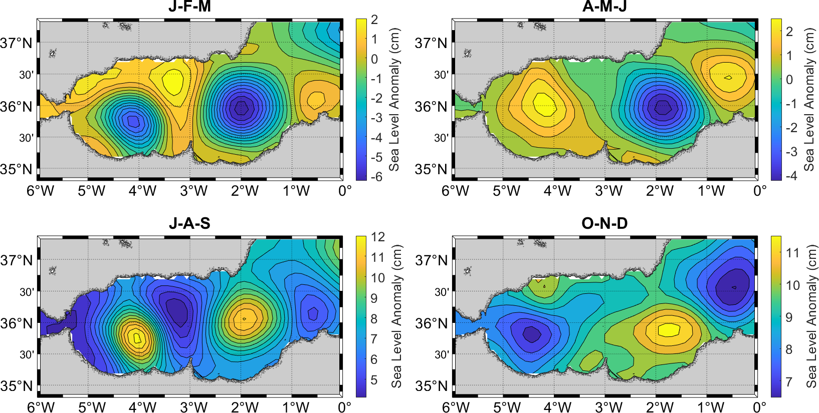 Seasonal climatology of Sea Level Anomaly (SLA) in the Alboran Sea (period 1993–2021). Isolines are shown every 0.5 cm. J-F-M: January–February–March, A-M-J: April–May–June, J-A-S: July–August–September, O-N-D: October–November–December. CMEMS product: SEALEVEL_EUR_PHY_L4_MY_008_068.