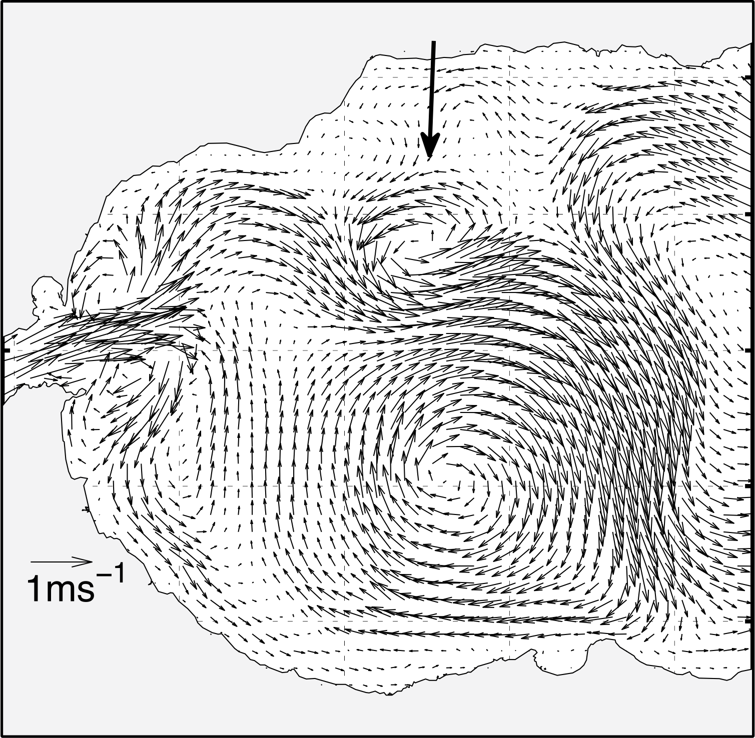 where and ; here, ui and hi denote velocity and thickness of the surface (i = 1) and bottom layers (i = 2), and g′=2g(ρ2−ρ1) / (ρ2+ρ1) is the reduced gravity. The hydraulic state of the flow is determined by the value of G2. The flow is classified as critical, subcritical, or supercritical according to G2 = 1, G2 <1, or G2 >1, respectively. The flow criticality can be interpreted in terms of the direction that information can travel through the flow by long interfacial waves. Critical flow (G2 = 1) implies that one of the two interfacial waves supported by the flow is stationary (i.e., it has null phase velocity). Subcritical flow (G2<1), typically occurring in relatively stagnant regions, implies that the two waves travel in opposite directions. Similarly, in supercritical regions (G2 >1) both waves propagate in the same direction. An important consequence is that the flow can become unstable (with respect to long waves) only in critical or subcritical regions—mathematically, the phase speed of the interfacial disturbances becomes complex conjugates. Therefore, strong mixing due to instabilities is expected to occur where the flow turns supercritical. Other recognized locations where intense mixing occurs are across hydraulic jumps, regions of the flow matching supercritical-to-subcritical conditions.