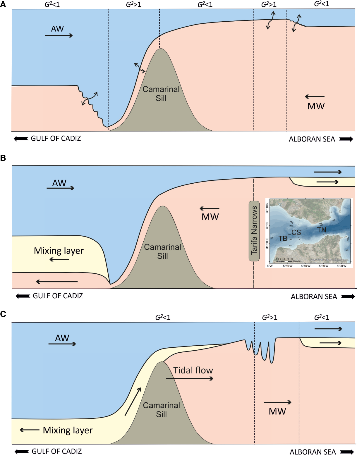 The Atlantic Water entering through the SoG is composed of surface Atlantic Water and colder and nutrient-richer North Atlantic Central Water. This inflow is enriched through the Strait because of vertical mixing with the underlying Mediterranean Water. Two-layer hydraulics provides guidance as to where and how vertical mixing occurs through the Strait (Armi, 1986; Pratt and Whitehead, 2008). A useful dimensionless number is the internal composite Froude number