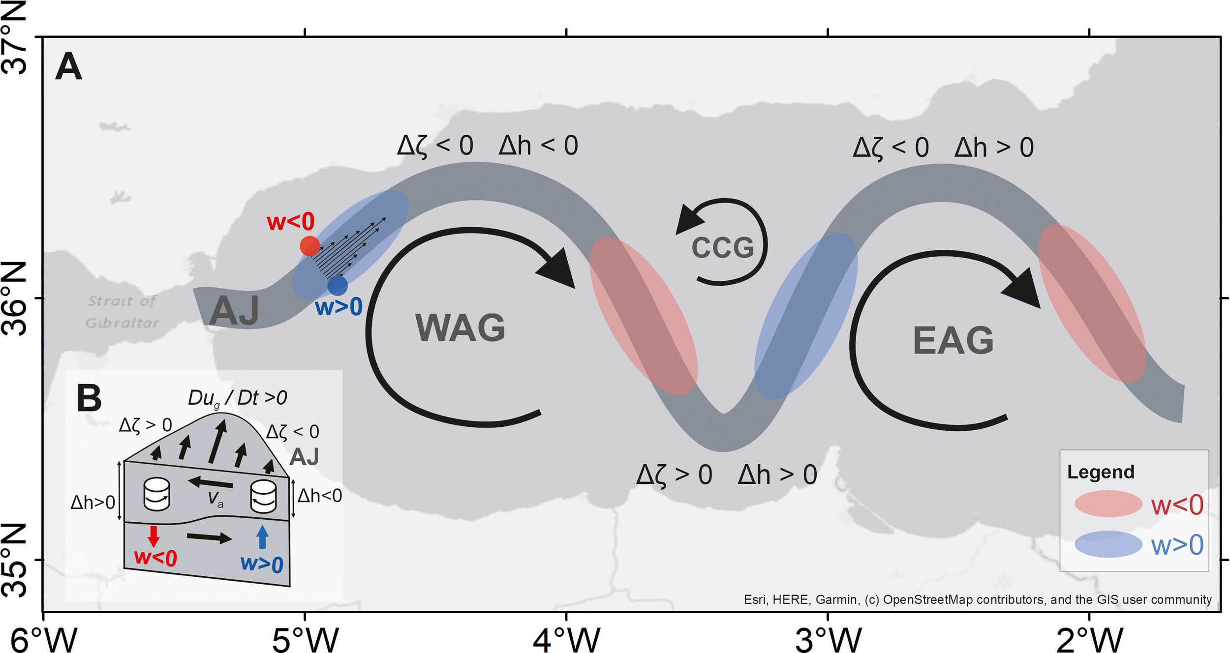 The ageostrophic frontal dynamics of the AJ is another source of fertilization of the AS surface waters. In a general context, the permanent density fronts of the AS make this sea an ideal setting for investigating the dynamics of density fronts, characterized by large vertical velocities (w) and enhanced primary productivity. Tintoré et al. (1990) and Gomis et al. (2001) estimated vertical velocities of the order of ~15 m d−1 in western Alboran based on the omega equation (Holton, 2004). These calculations hence rely on quasi-geostrophic theory and the assumption of slight departures from geostrophic balance, as quantified by a small Rossby number, Ro=U/fL<<1 (U is the downstream velocity component, L is the transversal length scale of the AJ, and f the Coriolis frequency). The pattern of vertical velocity was such that upward and downward motions occurred upstream of meander crests and troughs, respectively (Figure 7A). A similar structure has been found in the Gulf Stream and in atmospheric jet streams (Newton, 1978; McWilliams et al., 2019 and references therein). The pattern is consistent with changes in the relative vorticity of the jet ζ=∂v/∂x−∂u/∂y being controlled by curvature vorticity over crests and troughs, so that the jet is vertically stretched and squeezed over these regions to conserve potential vorticity (ζ+f)/h (here h is the vertical thickness of the jet).