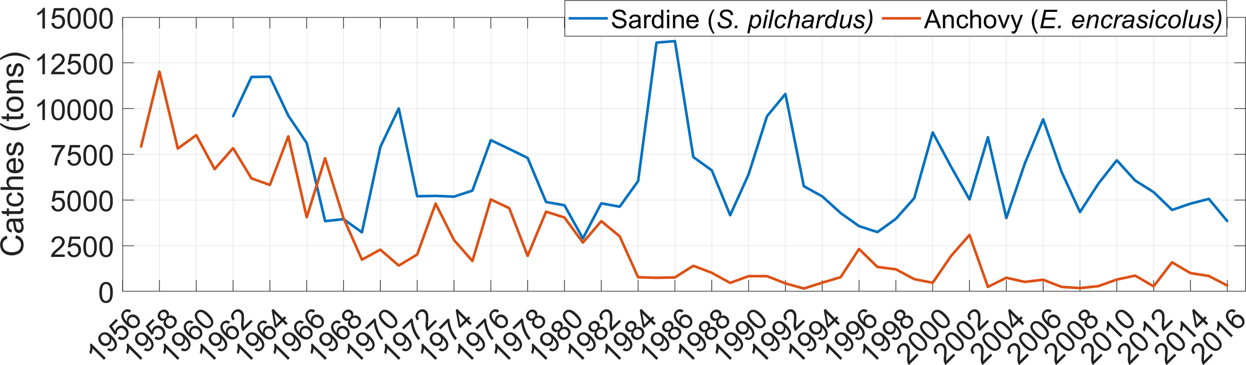 Time series of sardine (blue) and anchovy (red) landings in north Alboran. Data were obtained from the official statistics of the General Fisheries Secretariat (SGPM), Fisheries Regulatory and Market Fund (FROM), and the Spanish Institute of Oceanography (IEO).