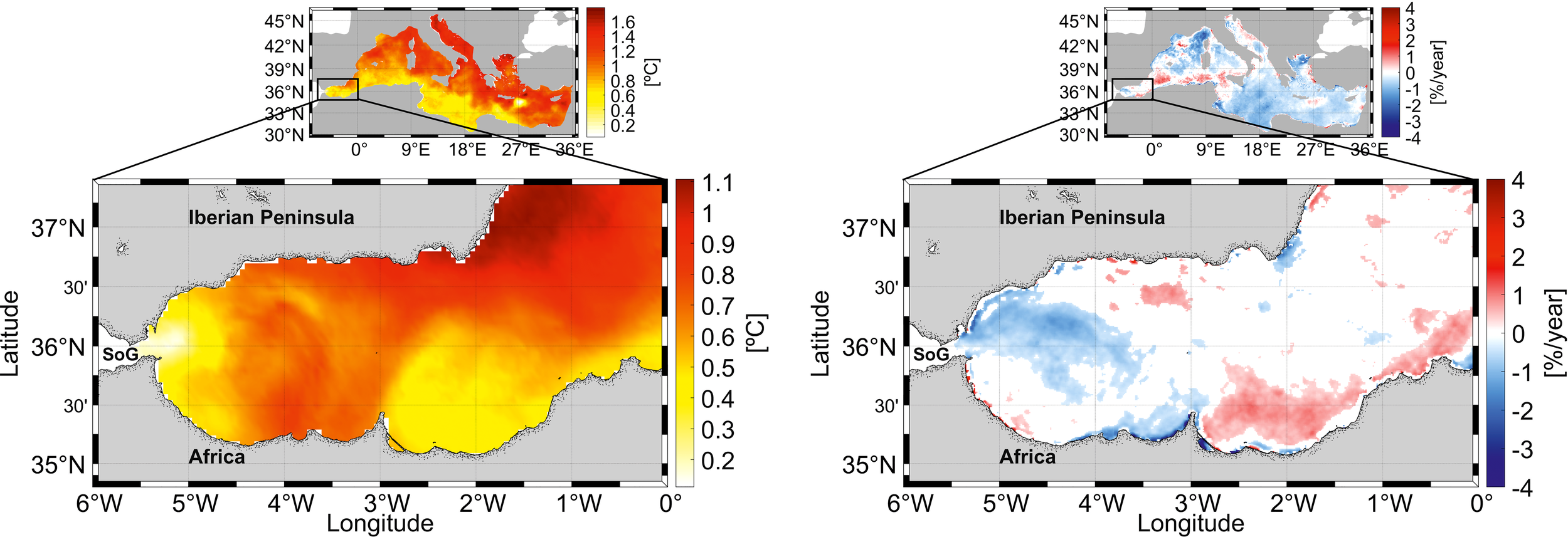 Right panels: Sea surface temperature cumulative trend over the period 1993–2020 in the Mediterranean (upper side) and in the Alboran Sea (lower side), calculated as the rate of change (°C/year) scaled by the number of time steps (28 years). CMEMS product: SST_MED_SST_L4_REP_OBSERVATIONS_010_021. Left panels: Mediterranean Sea (top panel) and Alboran Sea (bottom panel) satellite chlorophyll trends over the period 1997–2020, expressed in % per year. CMEMS product: OCEANCOLOUR_MED_CHL_L4_REP_OBSERVATIONS_009_078.