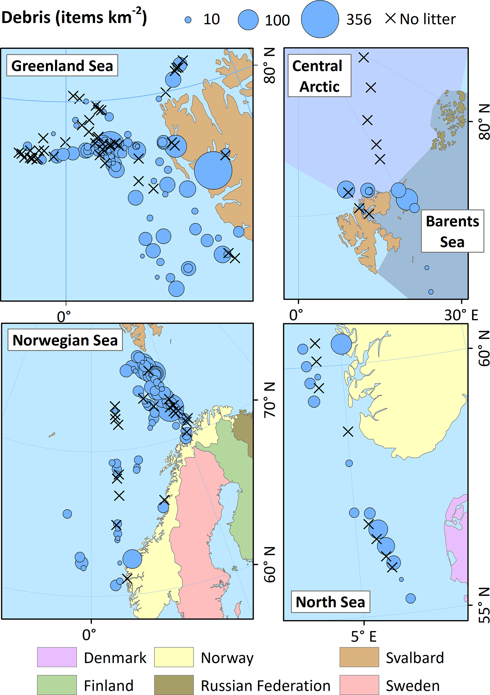 Concentrations of anthropogenic debris (number of items km-2) recorded in visual surveys in the Central Arctic, Barents Sea, Greenland Sea, Norwegian Sea and North Sea. The four southern transects in the North Atlantic region are not shown to improve the scaling of the maps. The sizes of the bubbles are proportional to the debris concentrations of the transects. Crosses denote transects with zero records.