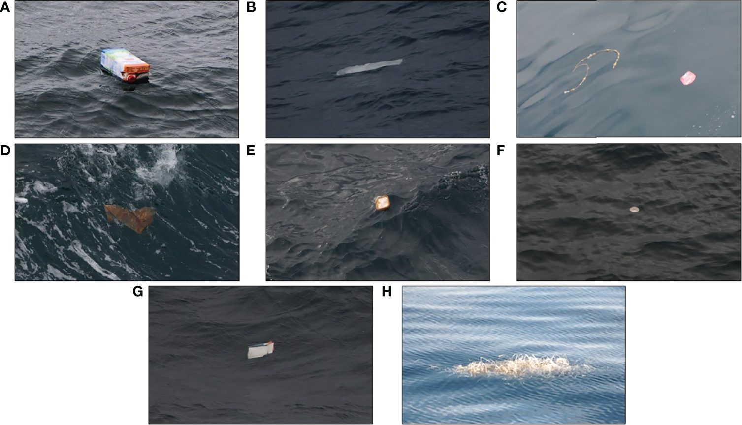 During surveys, a strip width of 10 m next to the ship starting behind the bow wave of the research vessel was inspected for floating items. Since SV Antigua is a relatively small vessel, the bow wave was negligible and the strip width was recorded for each transect depending on weather, wind conditions and visibility. The position of the observers above the sea level varied between 3 m (SV Antigua), 5.5 m (RV Heincke), 7.2 m (RV Maria S Merian) and 7.5 m (RV Polarstern). Each floating item was noted in protocol forms (see Supplementary Material). Objects seen in the distance outside the observation corridor were recorded but omitted from the analysis. A handheld Global Positioning System (GPS) device was used to record the position of the observer and the time of each observation. Aggregations of debris were observed occasionally. For some of these aggregations the abundance of floating debris was estimated. For two aggregations, “several dozen” were recorded in the protocols and to be conservative, the number of anthropogenic items was considered as 12 for the analysis. For three aggregations, no quantitative information was given. They were thus treated as single items.