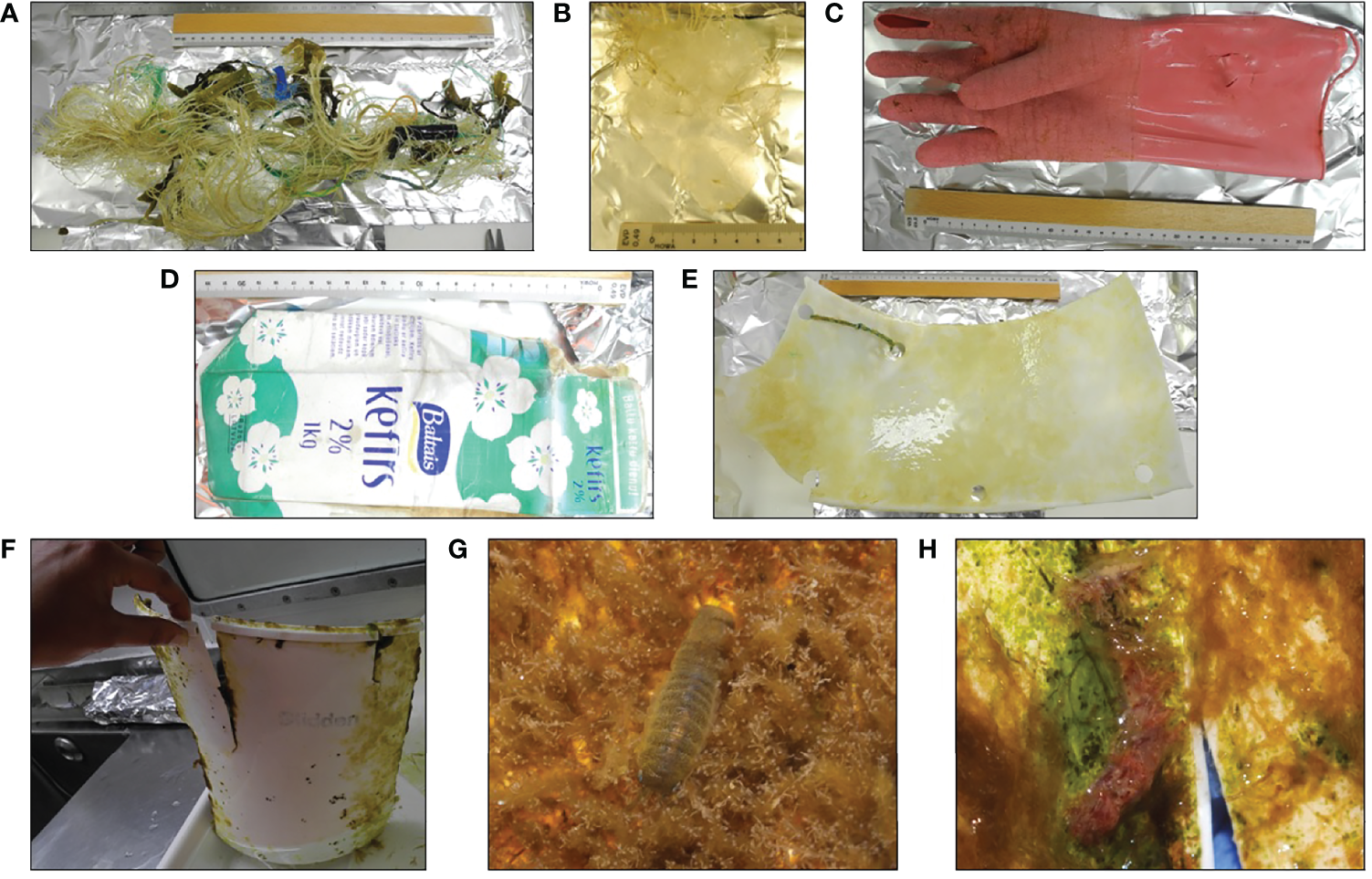 A fisheries glove, a kefir Tetra Pak manufactured in Latvia, two pieces of buckets and a bundle of ropes entangled with a transparent soft fragment (Figures 6A–F) were collected by hand in the Fram Strait. One box fragment was densely colonised by filamentous seaweeds and hydrozoans and hosted a rafting isopod of the genus Idotea and a cf. Dendronotus sp. nudibranch (Figures 6G, H).