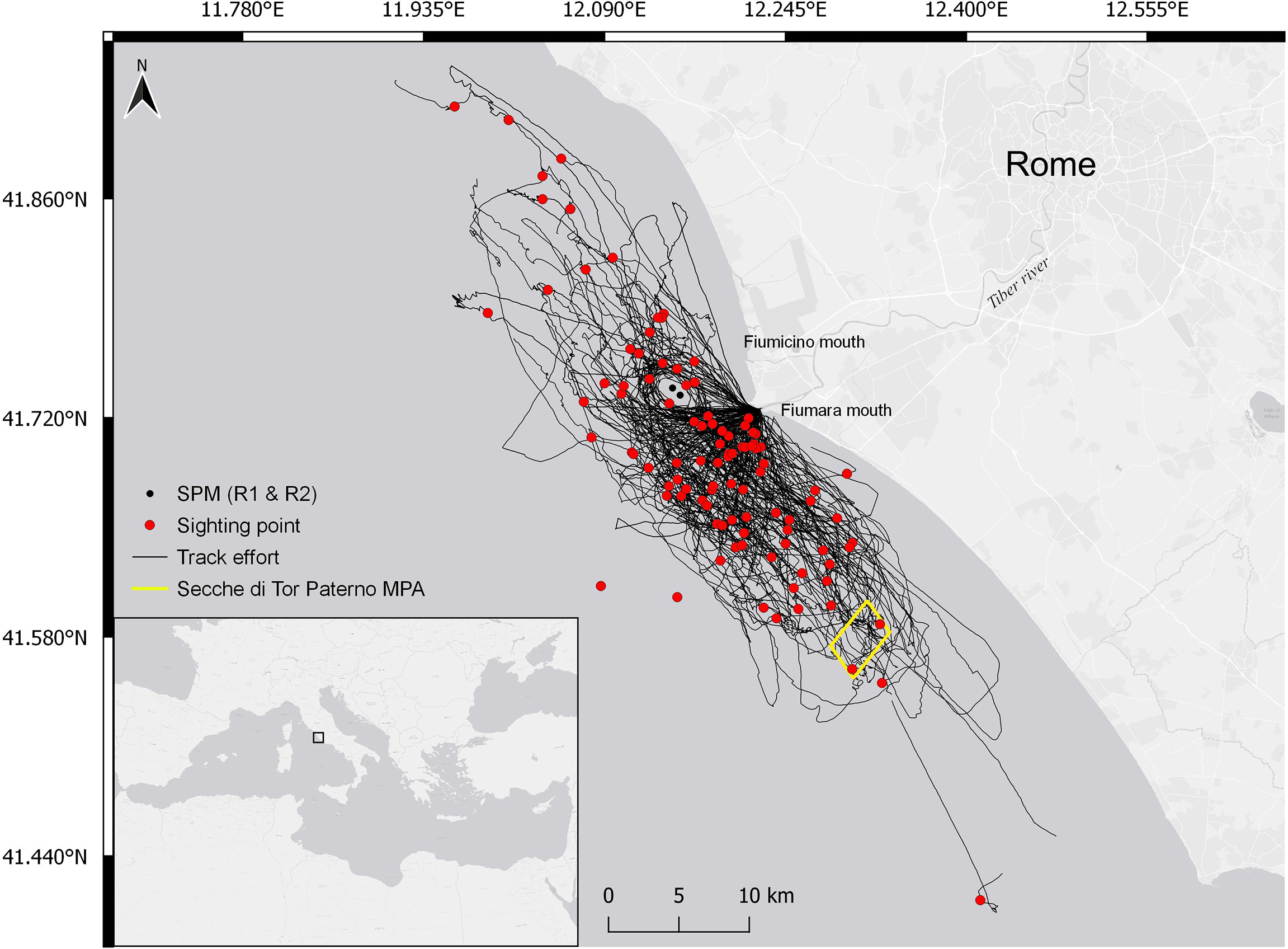 At about 3 nautical miles off the two Tiber River mouths is situated a terminal including two single-point moorings (SPMs) handling crude and petroleum products. Navigation, anchoring, diving, and fishing are banned within a radius of 750 m from each SPM. These structures are reported to attract some dolphin species (Triossi et al., 2013; Todd et al., 2020), as confirmed by the regular presence of groups of bottlenose dolphins around them (Pace et al., 2019; Pace et al., 2021). Bottlenose dolphins are also commonly reported at the mouths of the Tiber River and the Secche di Tor Paterno MPA (Pace et al., 2019; Pace et al., 2021; Martino et al., 2021). Three hundred forty-seven unique individuals have been photo identified, with females showing a high degree of site fidelity, low levels of dispersion, and localized movements (Pace et al., 2021). Mother–calf dyads have been observed throughout all survey seasons (May–November). Bottlenose dolphin occurrence is possibly favored by the ecological conditions and heterogeneity of morphological features of the region (Ardizzone et al., 2018). Water mass circulation generates upwellings that support high productivity, making the area a suitable site for both feeding and nursing bottlenose dolphins (Pace et al., 2019; Pedrazzi et al., 2022). The study area is considered a valuable ground for the commercial fishery as well (Ardizzone et al., 2018) and is characterized by a high proportion of small-scale artisanal fishery and larger trawling vessels (Ardizzone et al., 2018). Bottom trawlers belonging to the Fiumicino fleet, consisting of 25–30 vessels typically 18–25 m long, operate on both the continental shelf and the slope, running 1-day fishing trips from Monday to Friday year-round. Interactions with fishery were commonly observed in the bottlenose dolphin population frequenting the area (Pace et al., 2019; Pace et al., 2021; Pace et al., 2022). Dolphins have been observed foraging almost evenly across all the study sites, where target prey species (Blanco et al., 2001; Bearzi et al., 2009) are distributed. These include demersal species (European hake, Merluccius merluccius; red mullets, Mullus barbatus and Mullus surmuletus), small pelagic fishes (sardine, Sardina pilchardus; anchovy, Engraulis encrasicolus), cephalopods (common octopus, Octopus vulgaris; horned octopus Eledone cirrhosa), and crustaceans (shrimps, Parapenaeus longirostris; Norway lobster, Nephrops norvegicus), which are also main fishery targets (Ardizzone et al., 2018). Prey abundance appears to peak in August, with anchovies representing more than 20% of the fishery catches (EMODnet, 2022; EUMOFA, 2022).