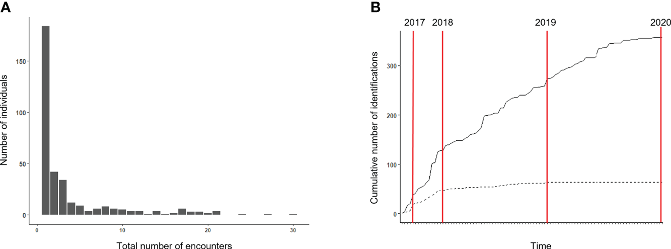 (A) Frequency distribution of the number of encounters of individual bottlenose dolphins. (B) Cumulative discovery curves for bottlenose dolphin individuals over the study period. The solid line shows the discovery curve for the overall 347 individuals identified; the broken line represents the discovery curve for the 68 individuals seen at least five times.