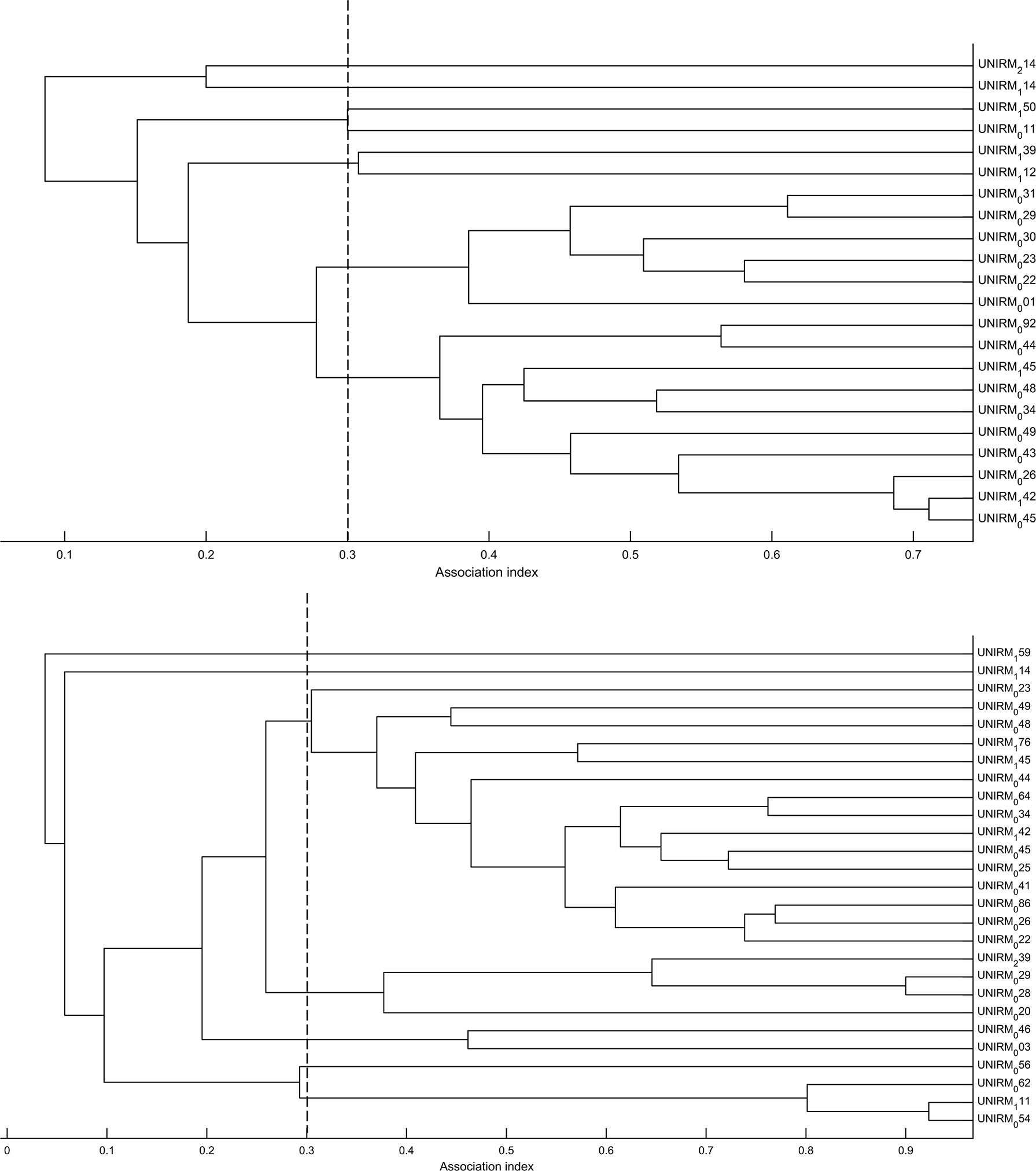 Hierarchical cluster analysis of female bottlenose dolphins (FO dataset, n = 23; top panel) and individuals mostly seen without interactions with trawling vessels (AT dataset, n = 27; bottom panel) using the half-weight index.