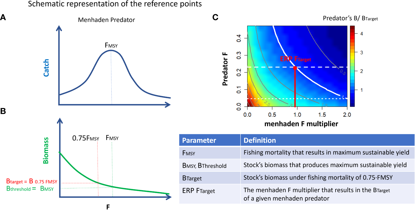 Schematic representation of reference points. (A)FMSY is defined as the fishing mortality that results in maximum sustainable yield. (B)BThreshold and BTarget are defined as the biomass that corresponds to FMSY and 0.75·FMSY, respectively. (C) Ratios (color map) of scenario’s biomass relative to the target biomass (Btarget) for menhaden predators as a function of variation in fishing mortalities for Gulf menhaden and their predators. A contour value of 1 indicates a state in which the predators’ biomass equals Btarget. The x-value of the intersect between the “1” contour and the horizontal dashed line represents the ERP Ftarget. ERP FTarget is the multiplier of menhaden F that results in the BTarget of a given menhaden predator and is represented as a vertical red line.