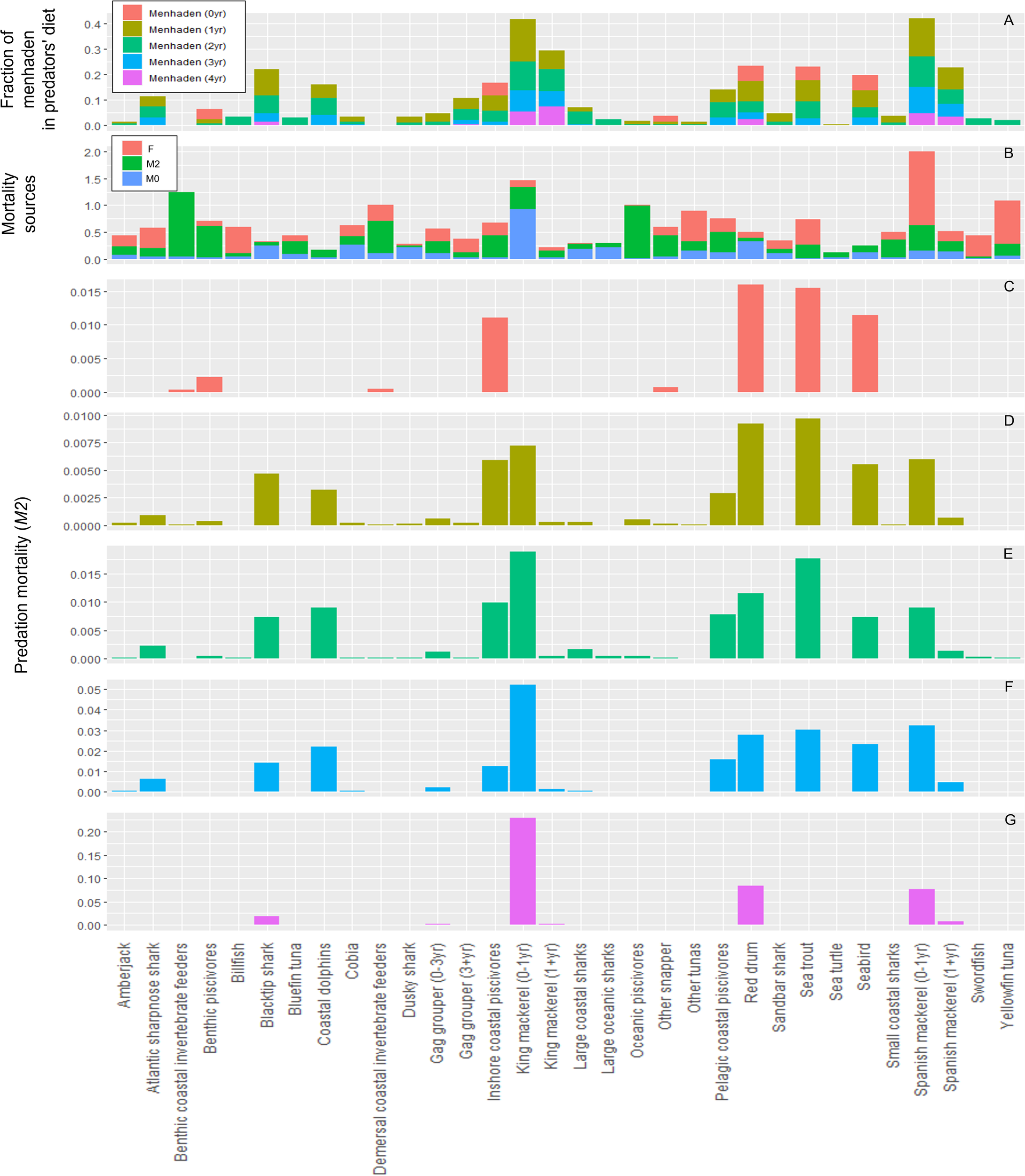 (A) The contribution of Gulf menhaden to the diets of its predators in the US Gulfwide Ecopath model. (B) Different sources of predators’ mortality (F: fishing mortality, M2: predation mortality; and M0: other mortality; units: year−1). (C–G) The contribution of predators to predation mortality (M2) of Gulf menhaden.