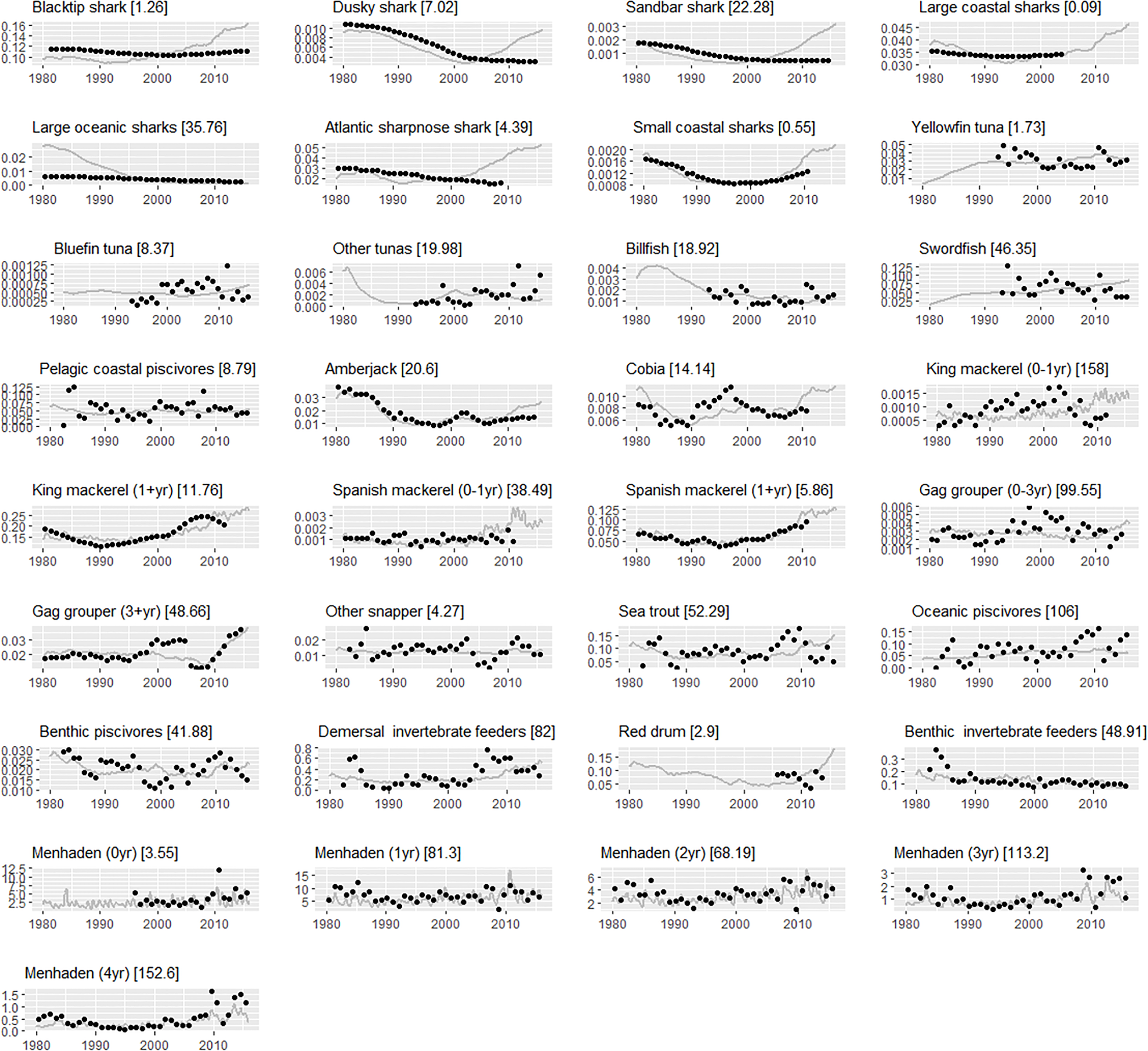Ecosim fits to landings (units: t km2 year−1) reference time series of select Gulf menhaden predators and Gulf menhaden age classes. The gray solid line represents the landings predicted by Ecosim and the black circles represent the landings reference time series. The sum-of-squared errors (SSE) of model fits are given in squared brackets. Note that SSE values provided here for each time series are dependent on the series specific weight (see Supplementary Table 3).