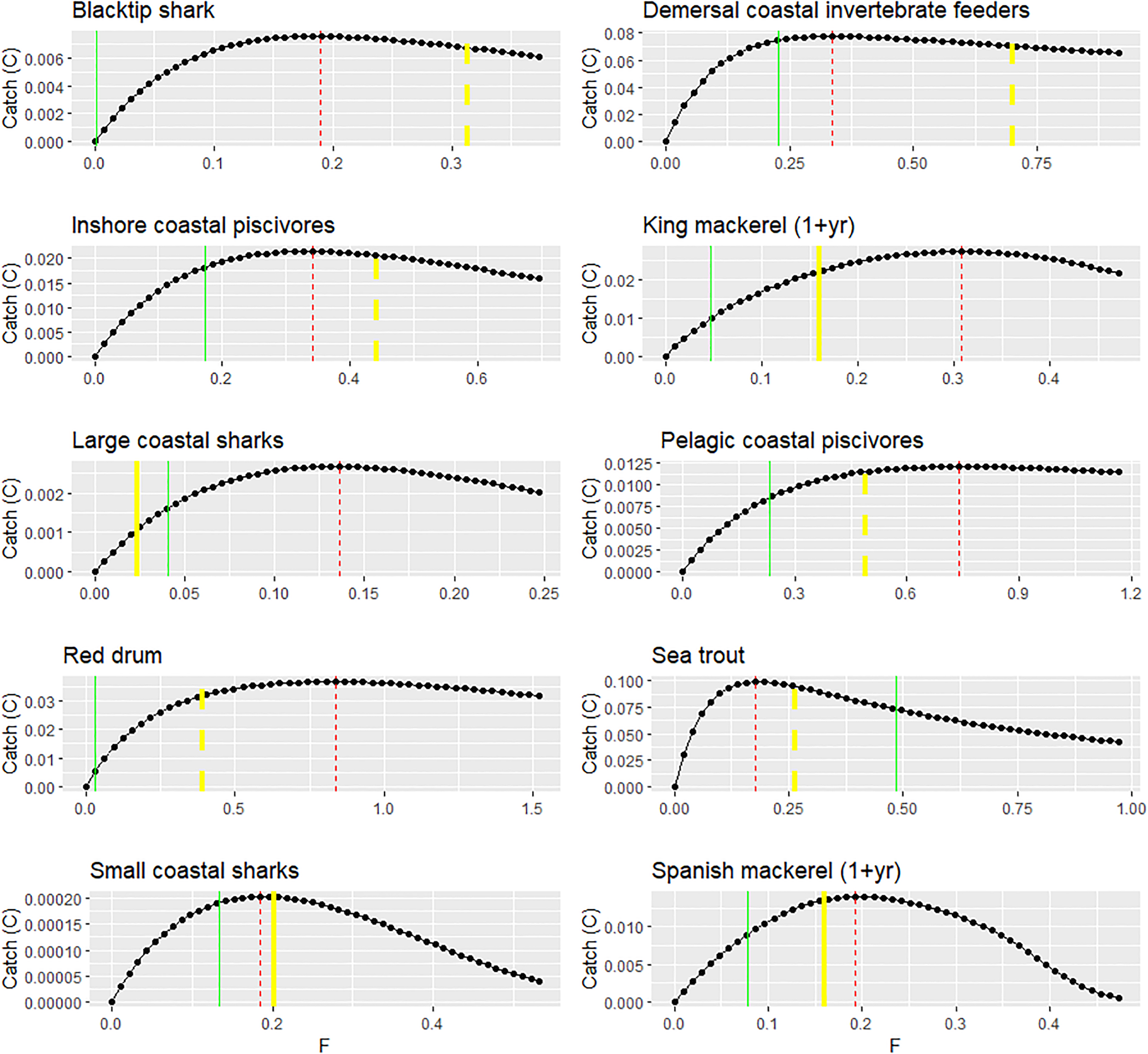 FMSY estimated from the Gulfwide EwE model compared to single-species stock assessment estimates or proxies for key Gulf menhaden predators. Red lines represent the EwE FMSY estimates (F units: year−1; catch units: t km2 year−1). Green lines represent FCurrent (for 2016). Yellow lines represent the FMSY estimated by a single-species stock assessment (solid line) or using the proxy FMSY = natural mortality (M) (dashed line).