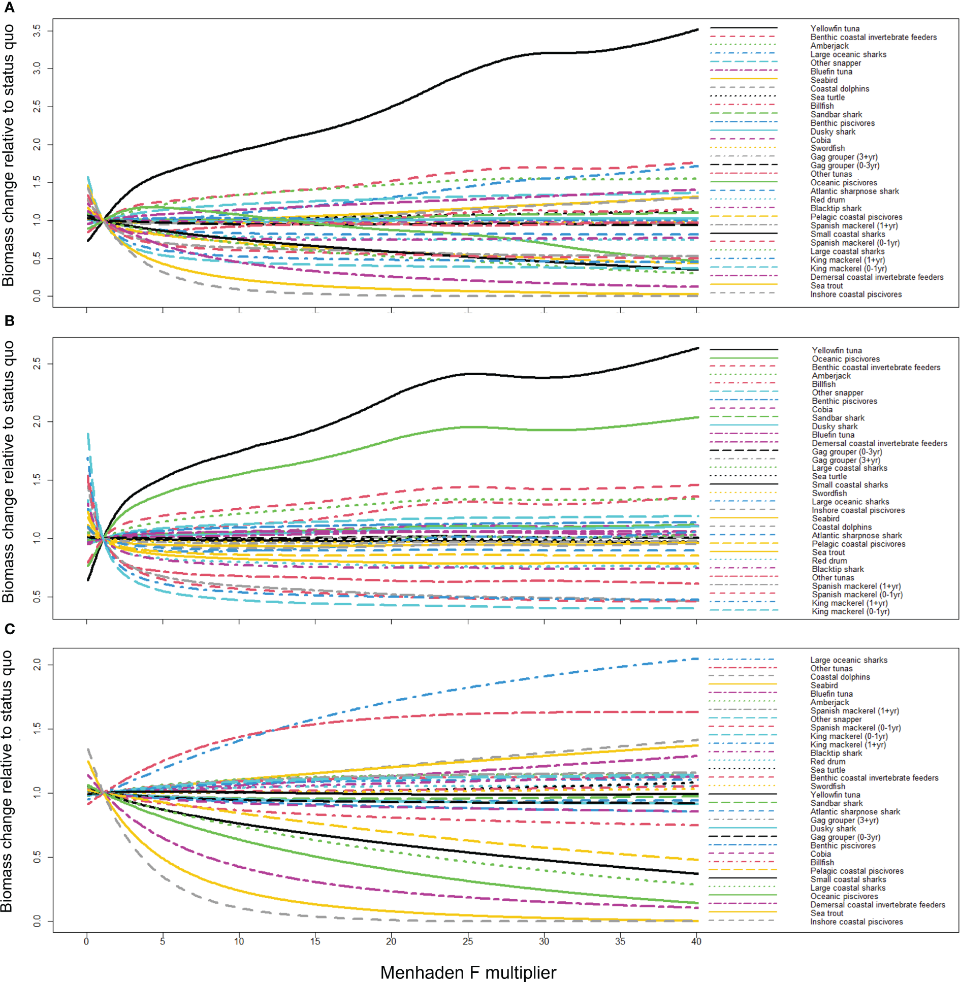 The equilibrium dynamics in Figure 6 indicate reciprocal trends, passing through the point of F and E multiplier value = 1 (x-axis) and relative biomass = 1 (y-axis). Groups that exhibit declines under high Gulf menhaden fishing pressure, such as inshore coastal piscivores, exhibit high biomass values under Gulf menhaden fishing pressure conditions closer to zero. Similarly, groups that exhibit an increase under high Gulf menhaden fishing pressure, such as yellowfin tuna, exhibit low biomass values when F and E multiplier values are close to zero. This pattern characterizes all three combinations of fishing pressure (Figures 6A–C).