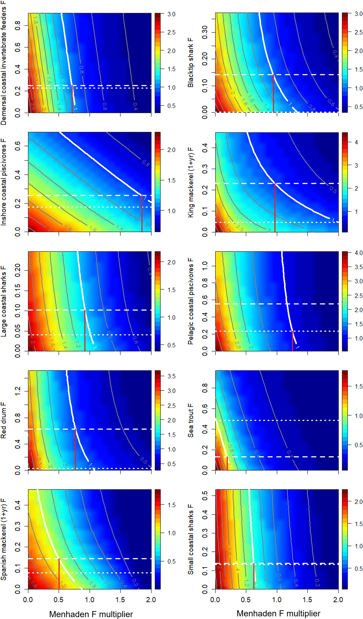 Ratios (color map) of scenario’s terminal year (2036) biomass relative to the target biomass (Btarget) for menhaden predators as a function of variation in fishing mortalities for Gulf menhaden and their top predators. Note that the x-axis represents the menhaden F multiplier (and not the actual menhaden F per se). Btarget was computed as the equilibrium biomass achieved when fishing at Ftarget, defined as 75% of FMSY from the equilibrium FMSY analysis. Dotted and dashed white lines represent 2016 fishing mortality estimates (FCurrent) and 0.75 FMSY, respectively. A contour value of 1 indicates a state in which the predators’ terminal year (2036) biomass equals Btarget. The x-value of the intersect between the “1” contour and the predator’s Btarget (horizontal dashed line) represents the ERP Ftarget (vertical red line). ERP Ftarget values are given in Table 1.