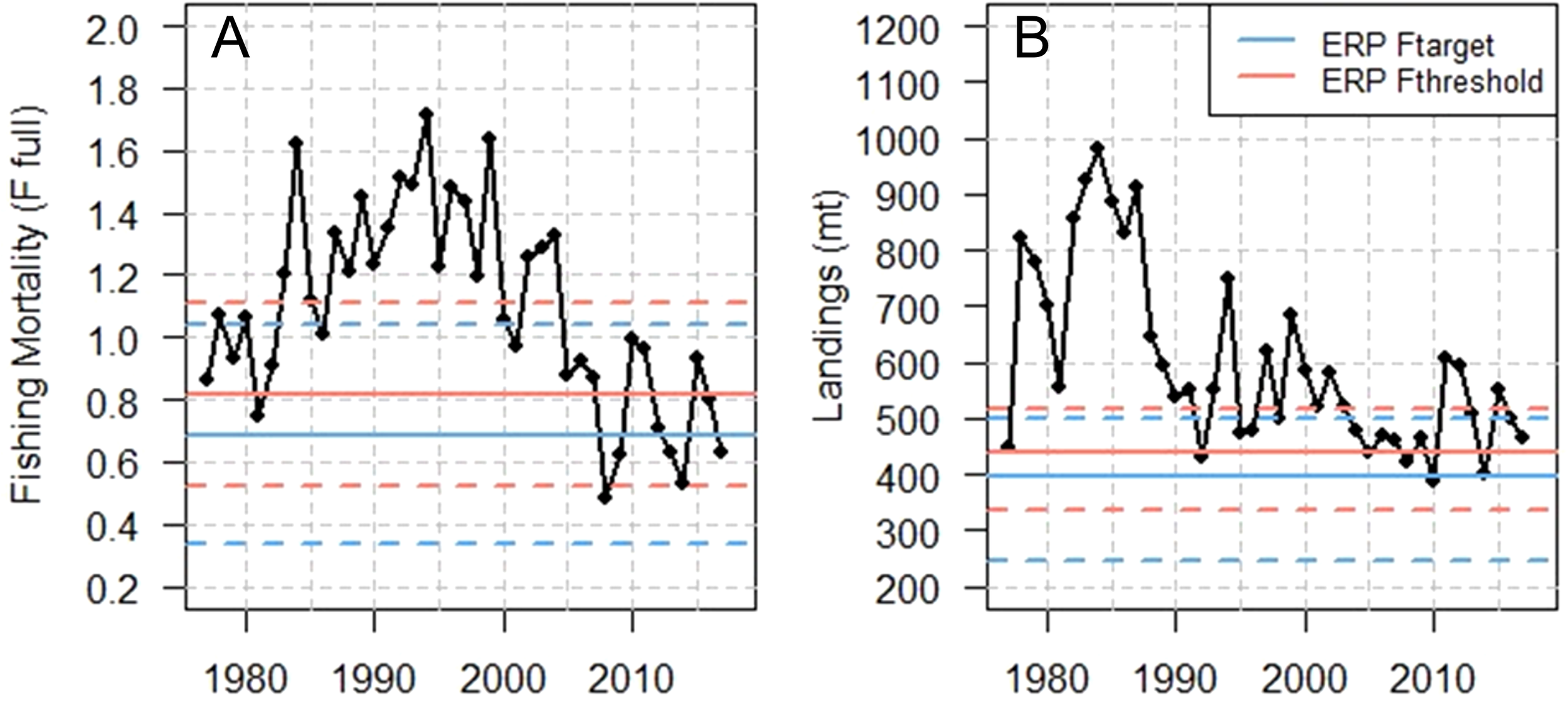 Projections of the above-defined ERP target, threshold, and upper and lower confidence intervals (CIs) of each were completed to determine the range in equilibrium landings that would result, which could be converted into a Total Allowable Catch. The code used was the same as the code developed and reviewed during the SEDAR 63 (2018) benchmark stock assessment for Gulf menhaden. Projections used a constant fishing mortality rate and were run for 5 years (2018–2022, as the terminal year of the single-species assessment was 2017). Uncertainty in runs was promulgated from the assessment to the projections using the Monte Carlo bootstrap (MCB) runs, which included uncertainty in the input data, specifically the landings, index values, composition data, natural mortality, and selectivity for the commercial reduction fishery for ages 3 and 4+. Numbers at age in the population were projected based on the results from the base run and each MCB run, while recruitment was projected using the underlying stock–recruitment curve from the base run and each MCB run. The projections provide a distribution of landings, fecundity, and recruitment that result from the constant, input fishing mortality rate.