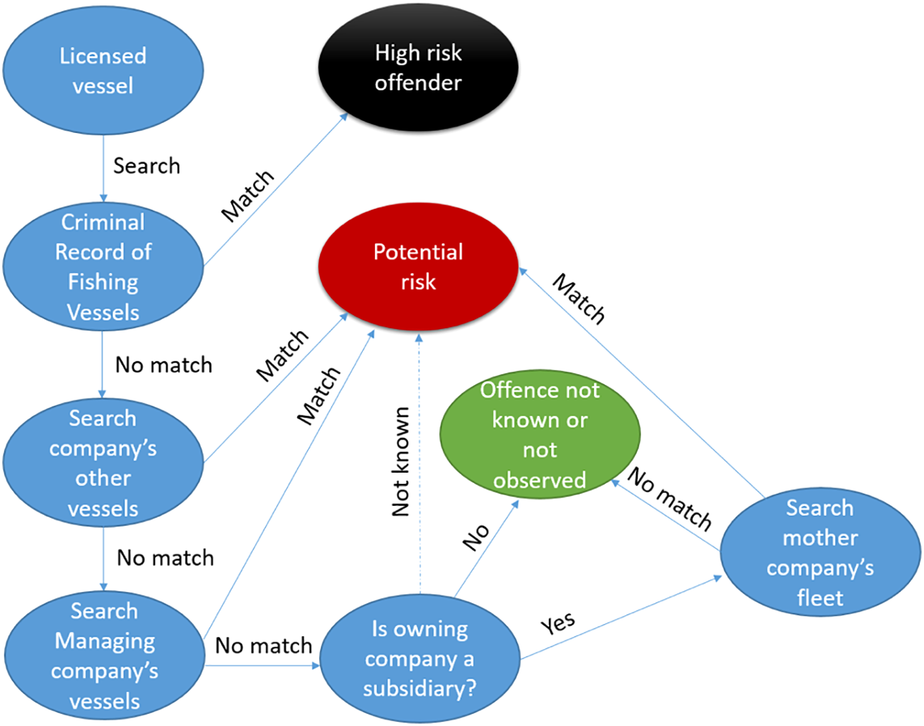 Process of identifying high-risk offenders, and potential high risk vessels by matching officially registered and licensed vessels. Information from government license lists and CRFV.