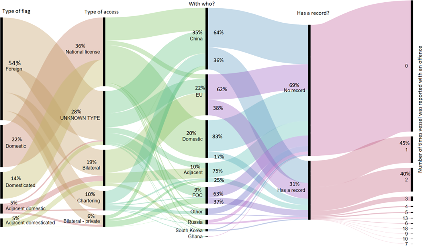 An analysis by type of adjacency reveals that national licenses, i.e., licenses to domestic and domesticated vessels, were the type associated with the highest number of reported offenses with 31%. We note that adjacency type could not be identified for 35% of the offenses. Bilateral agreements (notably with the EU, China, between Senegal and Guinea Bissau, and between Senegal and The Gambia) constituted 27% of all offenses recorded. Vessels10 under chartering agreements were responsible for 6% of all reported offenses.