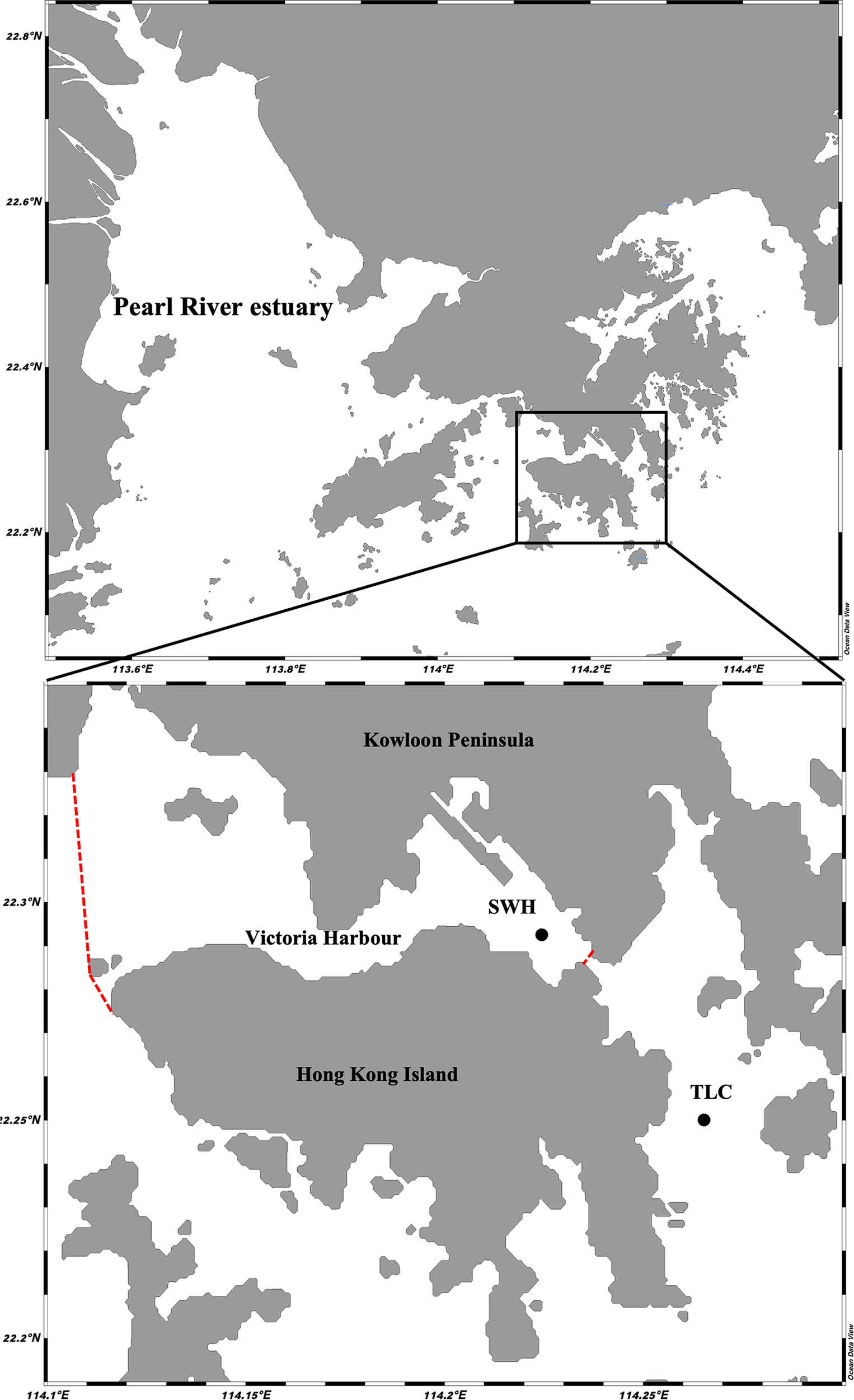 Map showing the relatively unpolluted site TLC and organically enriched site SWH in subtropical Hong Kong, the red dotted lines indicate the boundary of Victoria Harbour.
