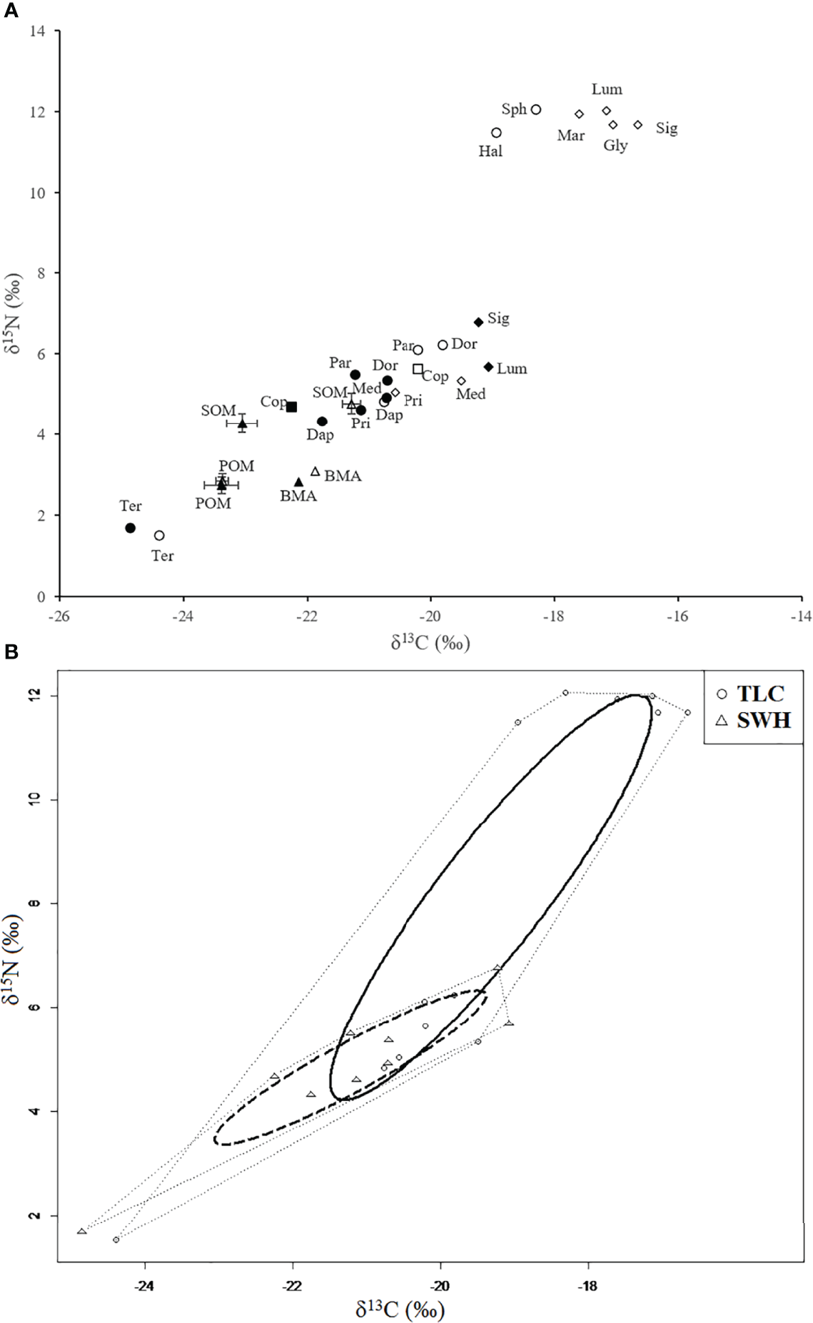 Stable isotope food web bi-plot for (A) all consumers and potential food sources at TLC (open symbols) and SWH (solid symbols). Each symbol represents the δ13C and δ15N values for nematodes (circles), copepods (squares), polychaetes (diamonds) and primary producers (triangles). Cop, Copepods; Dap, Daptonema sp.; Dor, Dorylaimopsis sp.; Gly, Glycera sp.; Hal, Halichoanolaimus sp.; Lum, Lumbrineris sp.; Mar, Marphysa stragulum; Med, Mediomastus sp.; Par, Paradontophora sp.; Pri, Prionospio sp.; Sig, Sigambra hanaokai; Sph, Sphaerolaimus sp.; Ter, Terschellingia sp.; (B) convex hull areas (thin dotted lines) and corrected standard ellipses areas (SEAc: bold lines) in the isotopic space for benthic communities sampled at the relatively unpolluted site TLC (circle) and organically enriched site SWH (triangle).