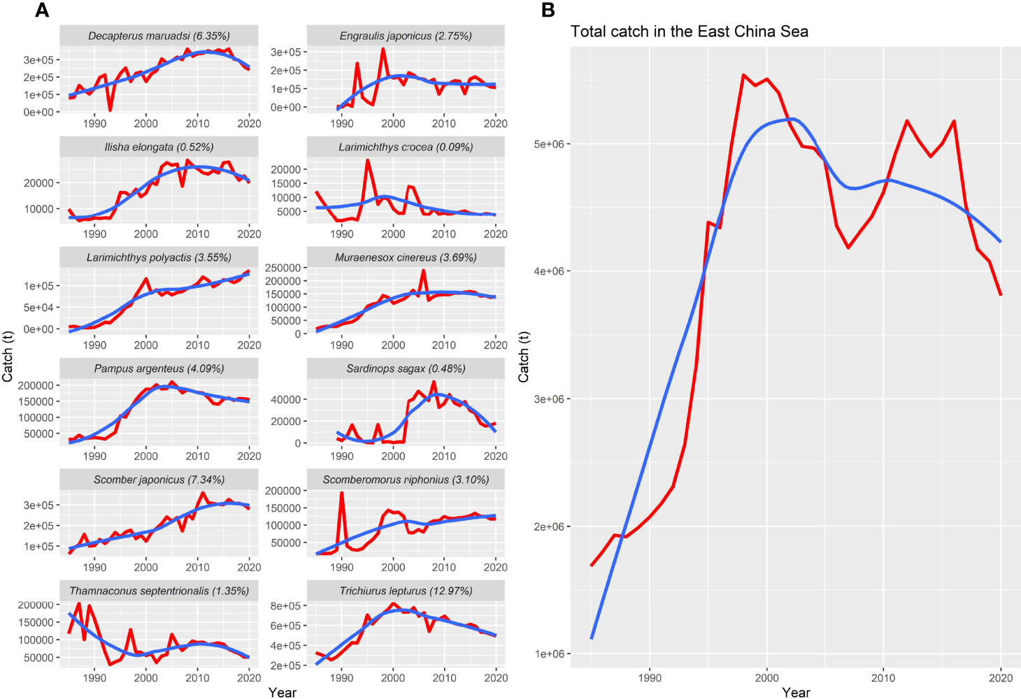 Catch trends of main commercial species (A) and the total catch (B) in the ECS during 1985-2020. The starting years of catch time series differ due to data availability of species. The value in percentage in brackets denotes catch proportion of total. The red and blue lines are reported catch and loess smoothing curves, respectively.