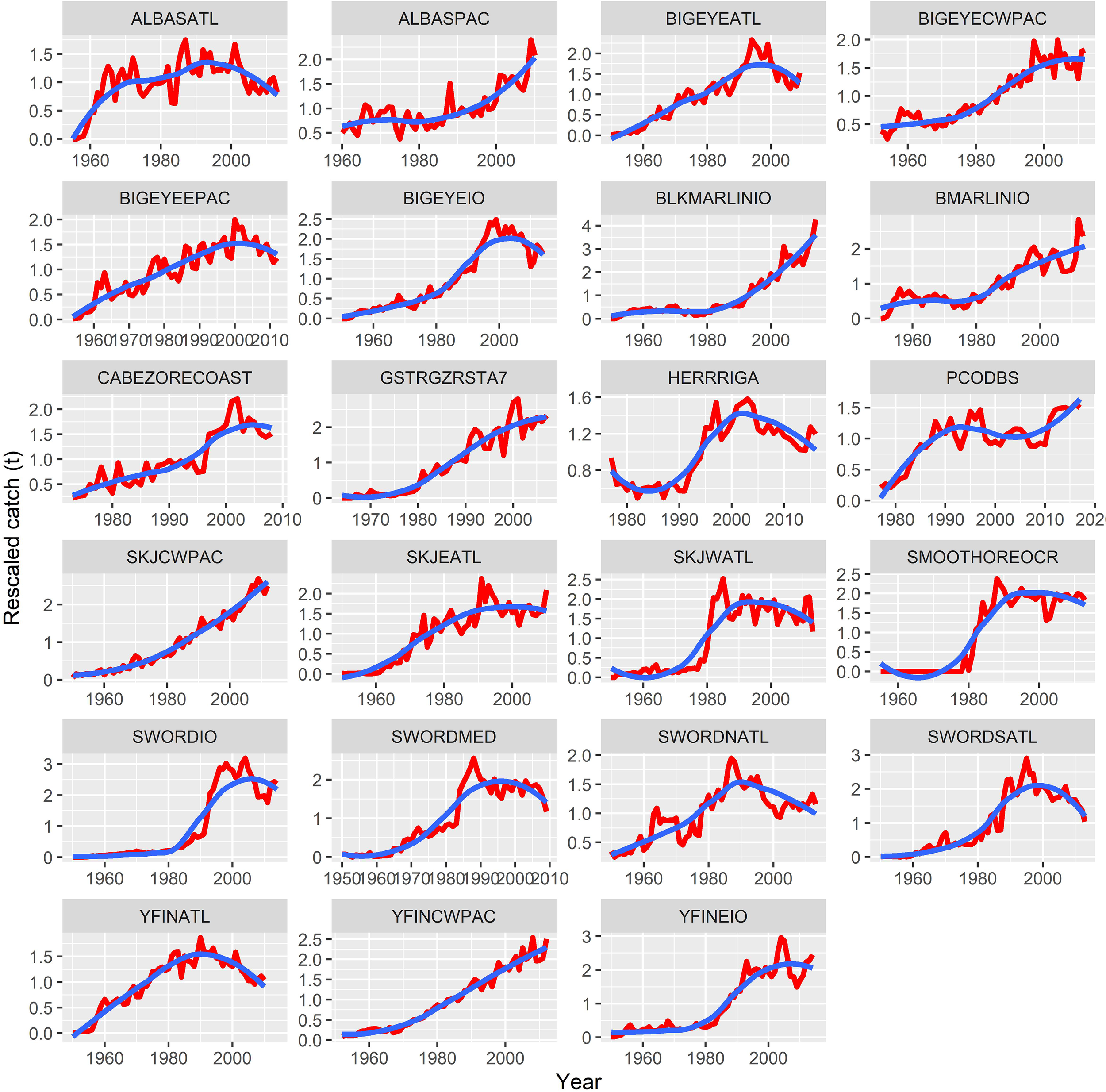 Catch trends of selected stocks in RLSADB. The header of each panel is the stock ID in RLSADB, see Table 1 for detailed stock information. The red and blue lines are rescaled catch and loess smoothing curves, respectively.