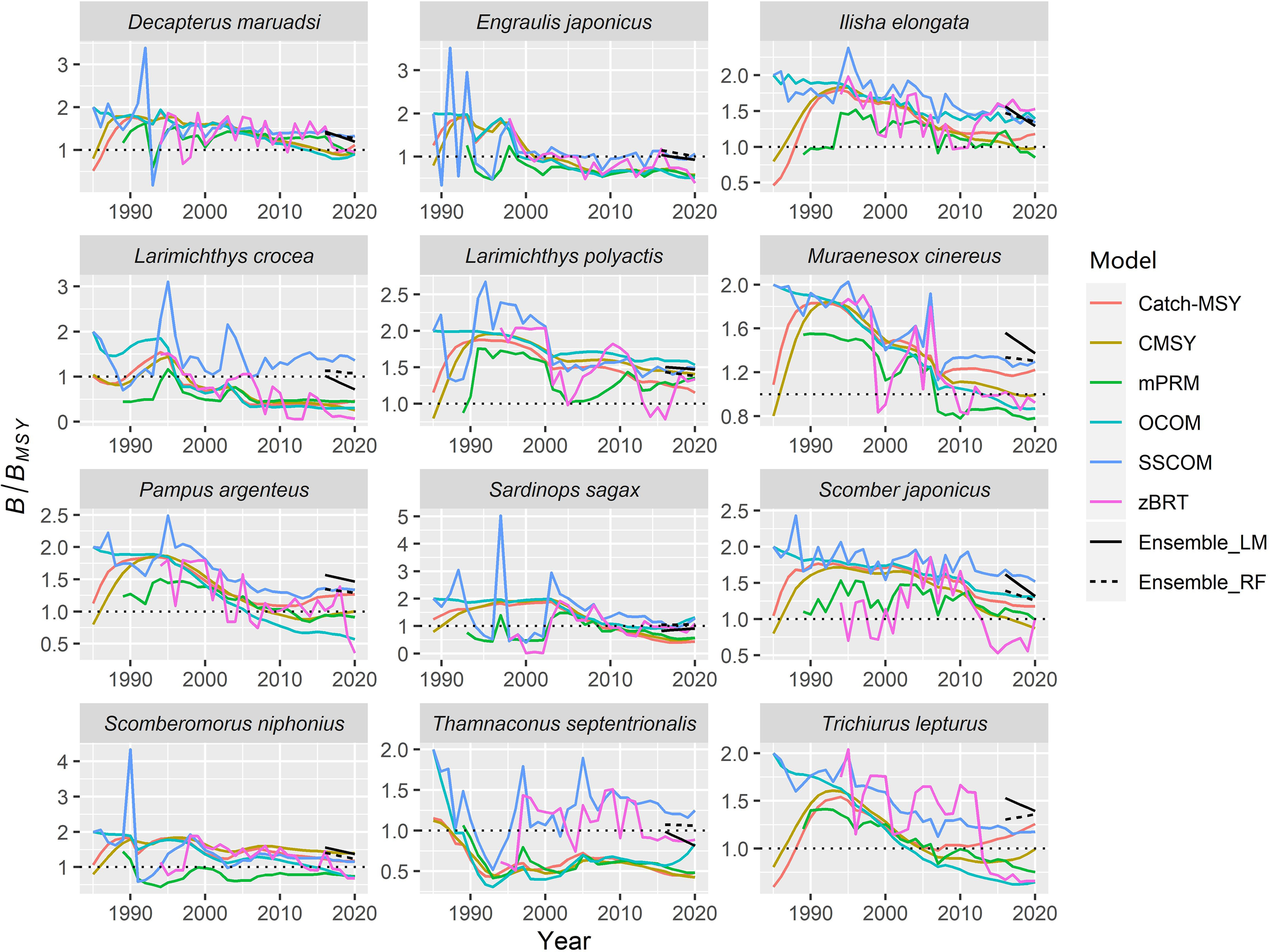 Time trajectories of B/BMSY estimates of individual and ensemble COMs for the stocks of ECS. The horizontal dotted line indicates B equals to BMSY.