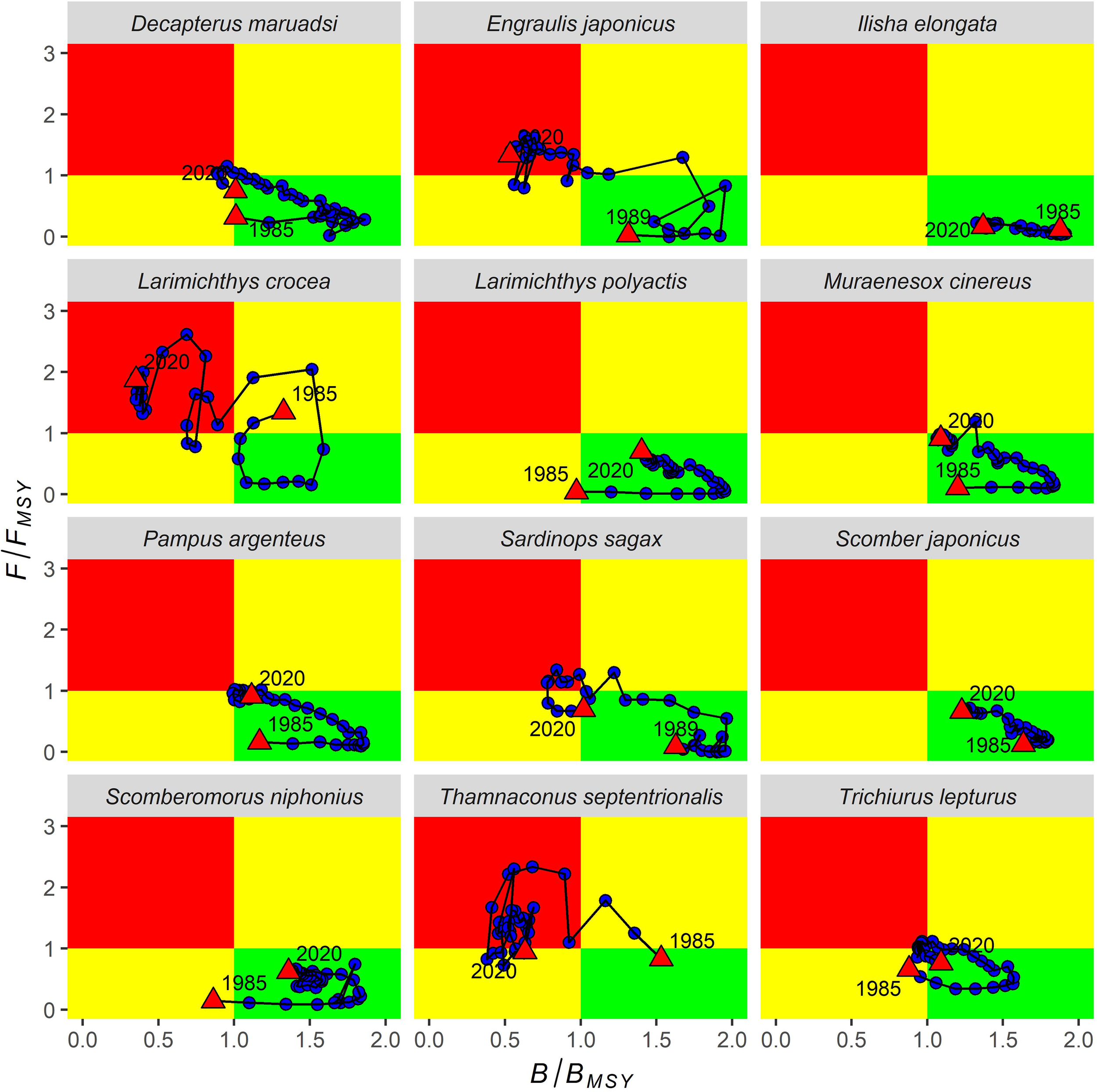 The highest weights in calculating time series of B and F as well as BMSY and FMSY among species were assigned by various methods (Table 3). For cases of I. elongata, L. polyactis and S. niphonius, individual model can account for over 80% weights of total in calculating weighted means of quantities. The three COMs assigned relatively even weights in calculating quantities for E. japonicus and L. crocea. The resulting weighted means of quantities were visualized as a Kobe plot to indicate the time trajectory of stock status for commercial species in the ECS (Figure 7).