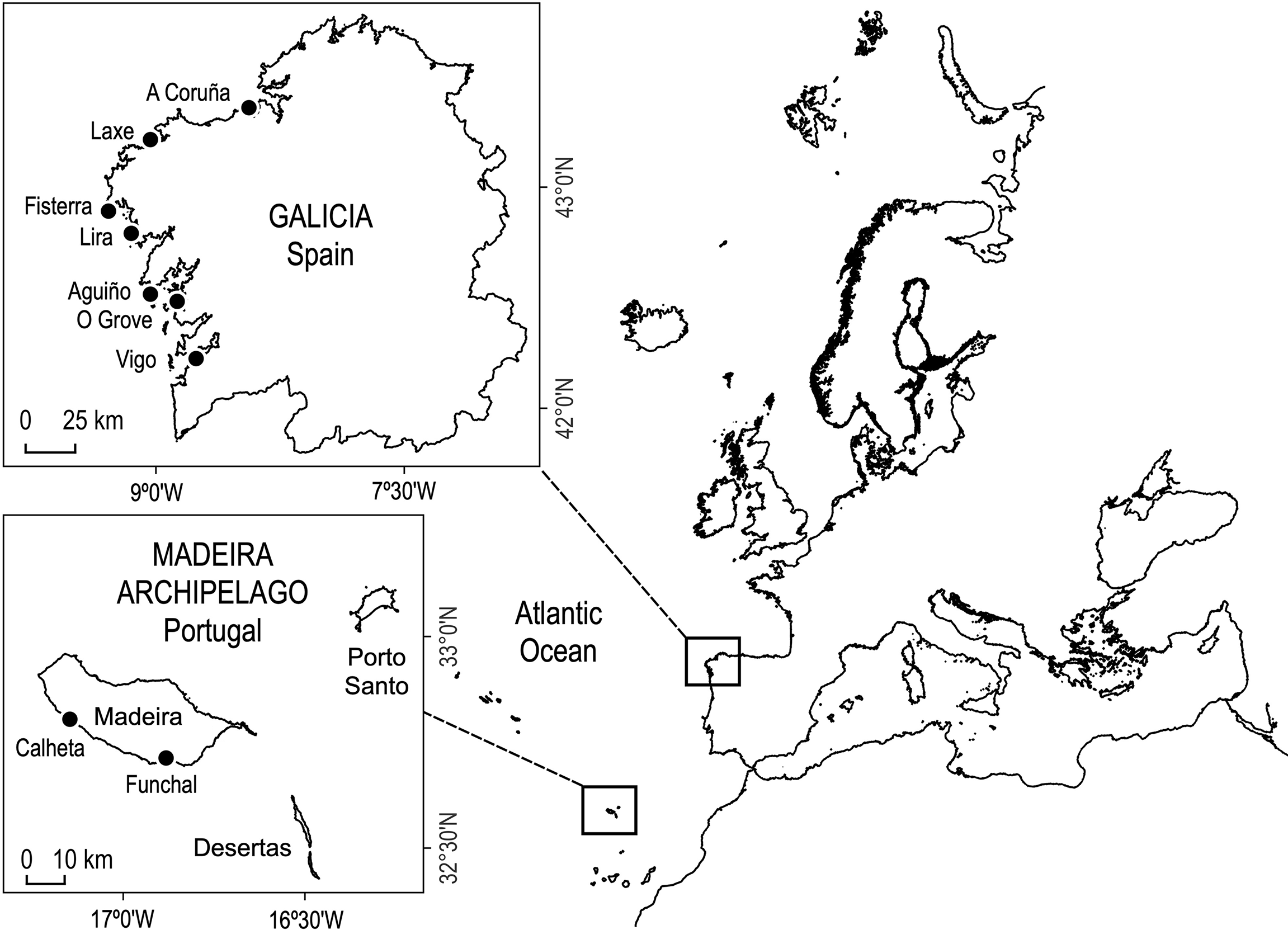 Map showing the location of Galicia (NW Spain) and Madeira archipelago (Portugal). We also show the marinas harboring recreational fishing charter boats.