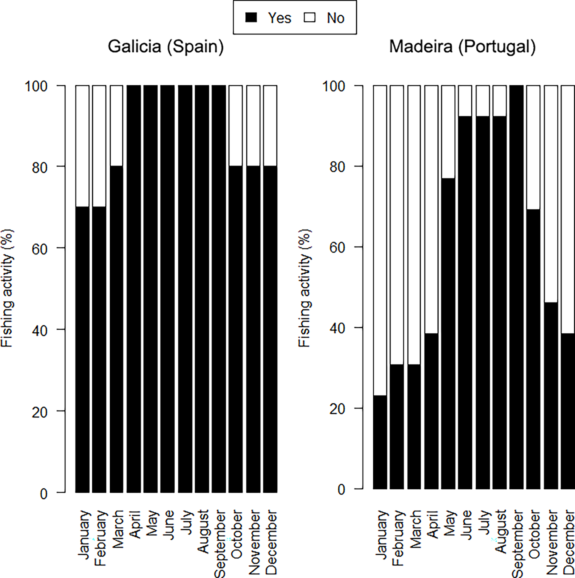 In Galicia we interviewed owners and skippers of 10 charter fishing boats belonging to 7 companies, which represents all the recreational fishing companies based in Galicia. In Madeira, we interviewed owners and skippers of 18 boats of a total of 20 currently operating in Madeira, belonging to the 14 companies, mainly based in Funchal and Calheta (Martinez-Escauriaza et al., 2021).