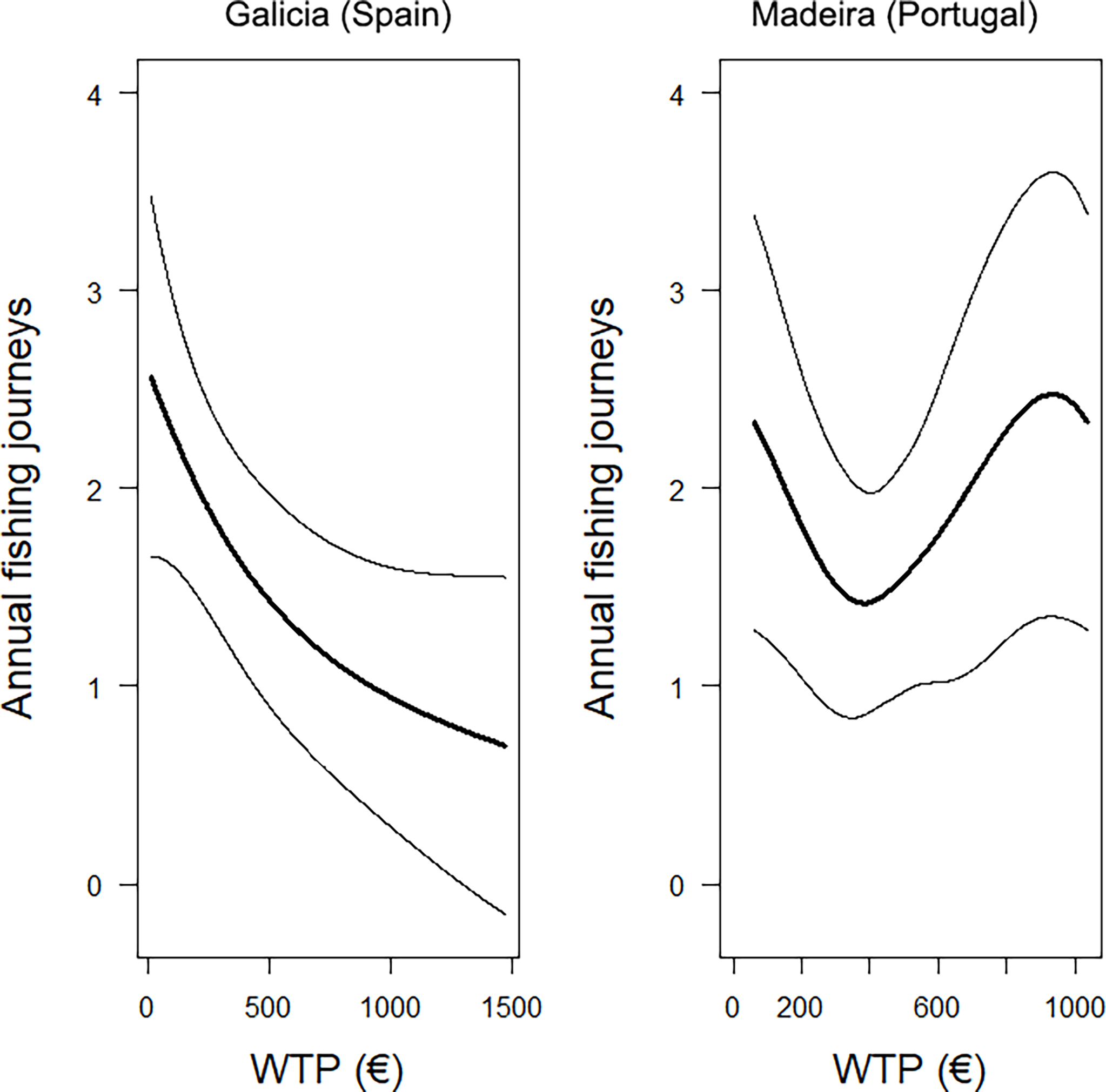 We used the parameters of the final models to calculate recreation benefit, or welfare in terms of the CS anglers derive from trips to Galicia and Madeira. We calculated the average individual CS for access by computing the area under the demand curve (Haab and McConnell, 1996) by adaptive quadrature methods and obtained confidence intervals following a Monte Carlo simulation to solve the numerical integrals. We then multiplied the results by the predicted number of persons by trip to obtain the predicted annual CS for the average visitor group.
