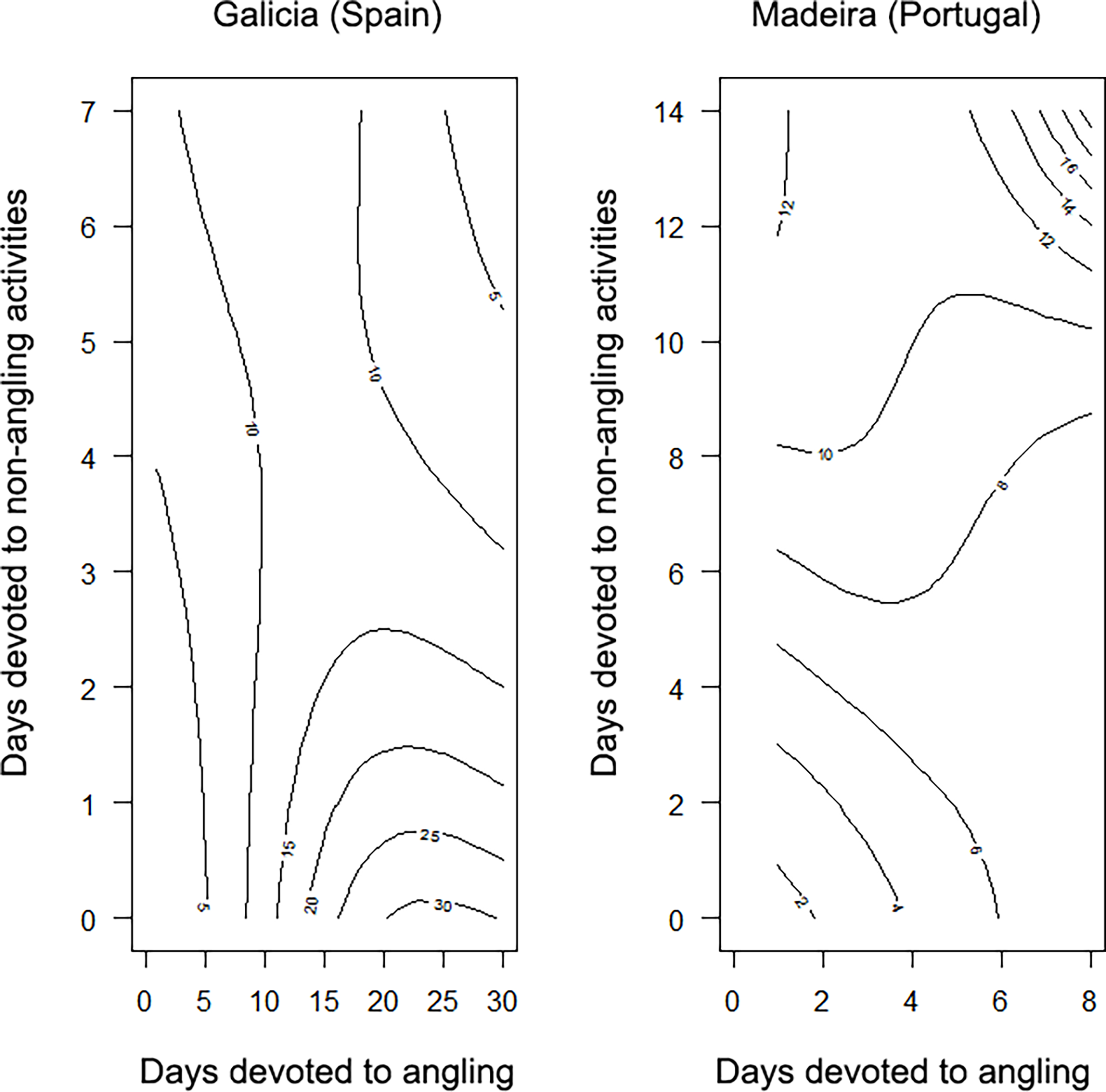 Where pi(·) represents the vector of other visitor-specific independent predictors. These predictors included Ni, which accounted for the number of days devoted to the practice of alternative leisure activities during the current fishing trip (following Roussel et al., 2016). Gi included group size, i.e., the number of people traveling with the angler, in the fitted GAMs (including non-angling travelers). Ai accounted for the willingness to choose alternative trips by including a factor variable (avidity) with 3 levels (Low, Medium, and High), based in the fishing days during the past year (that ranged between 0 and 80), and the country in which the fishing took place (national or foreign). Thus, Low included visitors that fished <40 days in their own country, Medium included visitors that fished ≥40 days in their own country, or <15 days in a foreign country, and High included visitors that fished ≥15 days in a foreign country. Si represents a set of visitors’ socio-economic and demographic characteristics, including age, gender, civil status, education level, number of people living in the household, number of underage people living in the household, job, working hours per month, revenue per month, residence country, and level of associativism (i.e., membership to fishing associations or clubs) to account for fishing avidity.